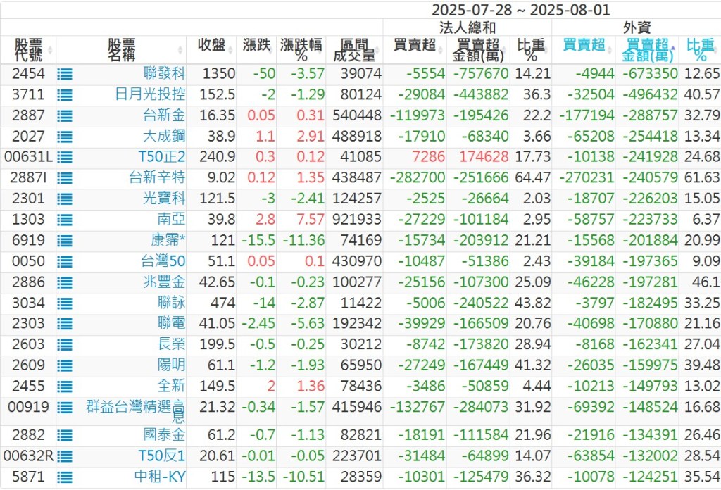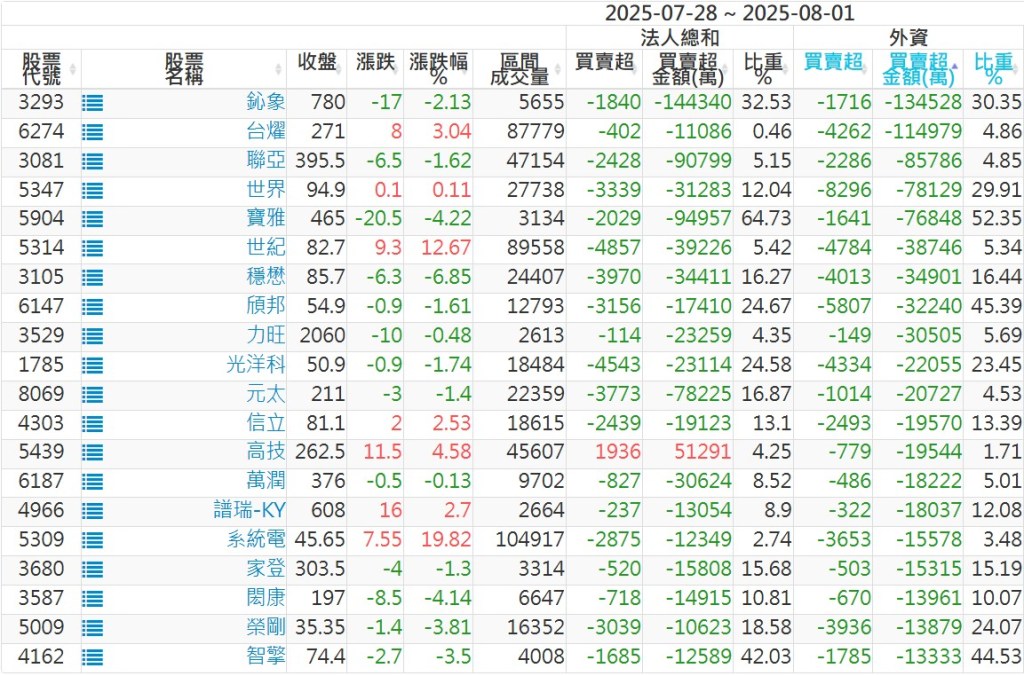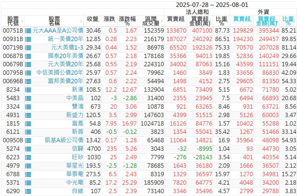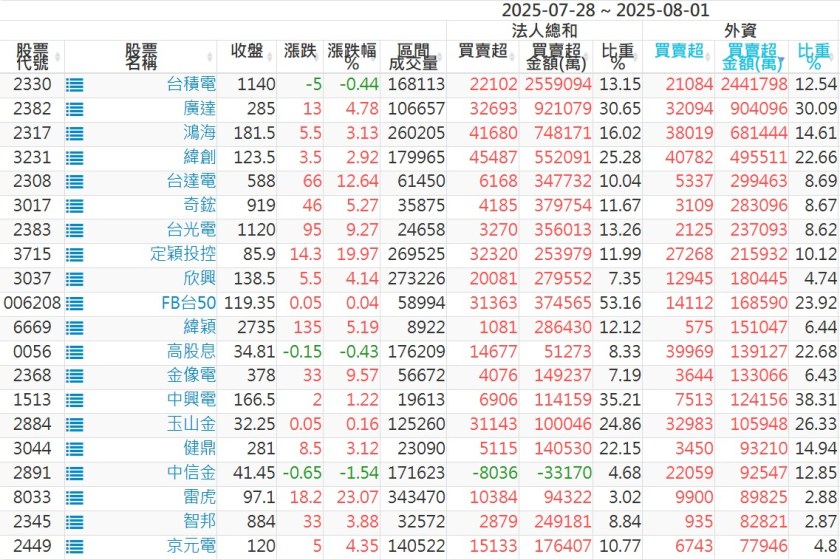 2025/07/28~2025/08/01近5日【外資】買賣超個股 2025-08-03 股狗網小編 投資誌-大盤 發表留言 外資本周累積【買超】約401億元。 【上市外資買超個股】(以金額排行,單位:萬) 【上市外資賣超個股】(以金額排行,單位:萬) 【上櫃外資買超個股】(以金額排行,單位:萬) 【上櫃外資賣超個股】(以金額排行,單位:萬) 免責宣言 本網站文章所提供資訊僅供參考,並無任何推介買賣之意,投資人應自行承擔交易風險。 分享此文: 按一下即可分享至 X(在新視窗中開啟) X 按一下以分享至 Facebook(在新視窗中開啟) Facebook 喜歡 正在載入...