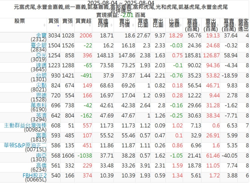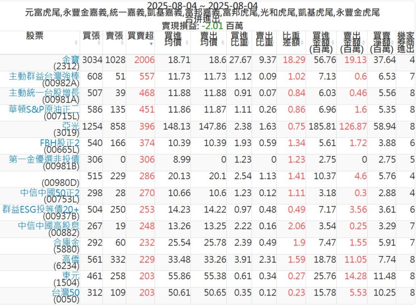 2025-0804主力買賣超個股 2025-08-04 股狗網小編 籌碼面每日資訊 發表留言 可參考下文 『如何查詢當沖、隔日沖分公司券商買賣』 主力當沖券商: 『元富虎尾』,『永豐金嘉義』,『統一嘉義』,『凱基嘉義』,『富邦嘉義』,『富邦虎尾』,『光和虎尾』,『凱基虎尾』,『永豐金虎尾』。 『當沖標的』 『買超股票』 『賣超股票』 免責宣言 本網站文章所提供資訊僅供參考,並無任何推介買賣之意,投資人應自行承擔交易風險。 分享此文: 按一下即可分享至 X(在新視窗中開啟) X 按一下以分享至 Facebook(在新視窗中開啟) Facebook 喜歡 正在載入...