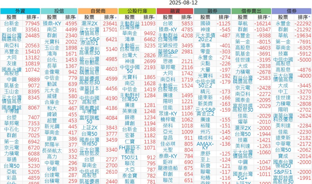 2025-0812【外資、投信】買賣超個股 2025-08-12 股狗網小編 投資誌-大盤 發表留言 上市:【外資、投信】買超(依金額) (單位:百萬) 上市:【外資、投信】賣超(依金額) (單位:百萬) 上市:【外資、投信】買超(依張數) (單位:張數) 上市:【外資、投信】賣超(依張數) (單位:張數) 免責宣言 本網站文章所提供資訊僅供參考,並無任何推介買賣之意,投資人應自行承擔交易風險。 分享此文: 按一下即可分享至 X(在新視窗中開啟) X 按一下以分享至 Facebook(在新視窗中開啟) Facebook 喜歡 正在載入...
