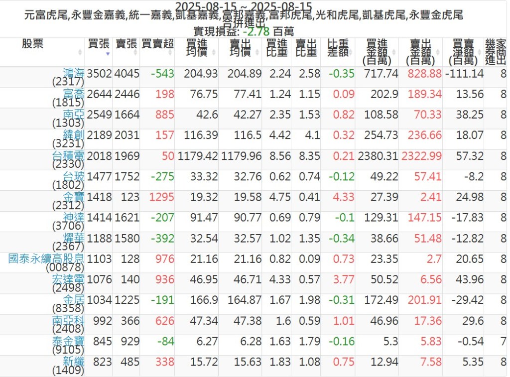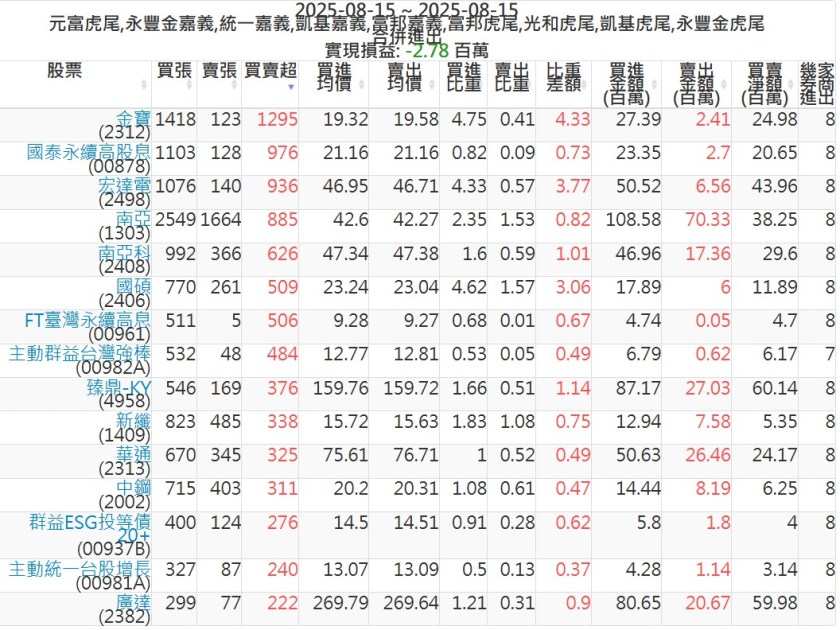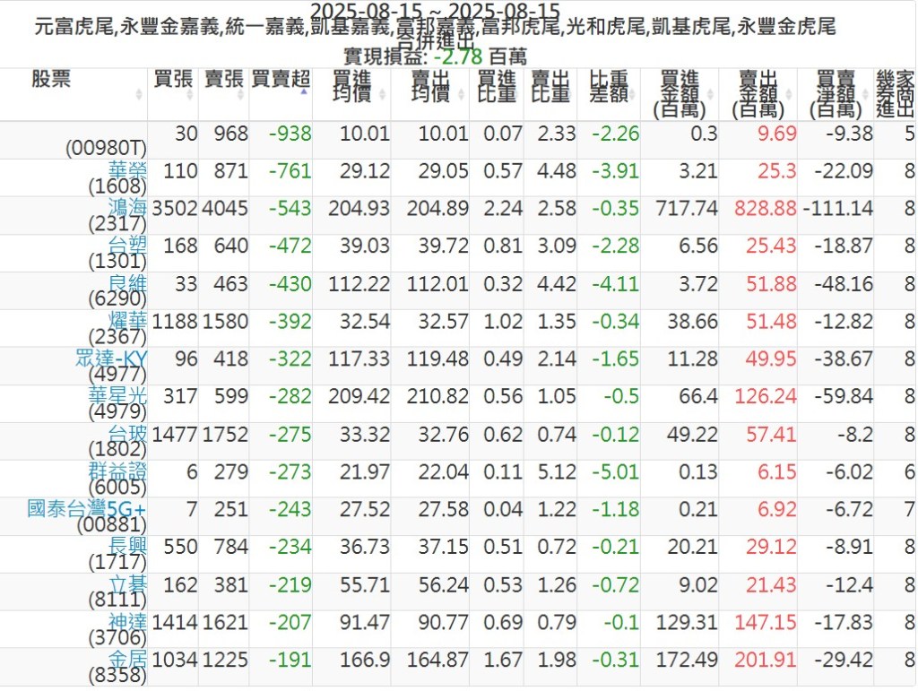 2025-0815主力買賣超個股 2025-08-15 股狗網小編 籌碼面每日資訊 發表留言 可參考下文 『如何查詢當沖、隔日沖分公司券商買賣』 主力當沖券商: 『元富虎尾』,『永豐金嘉義』,『統一嘉義』,『凱基嘉義』,『富邦嘉義』,『富邦虎尾』,『光和虎尾』,『凱基虎尾』,『永豐金虎尾』。 『當沖標的』 『買超股票』 『賣超股票』 免責宣言 本網站文章所提供資訊僅供參考,並無任何推介買賣之意,投資人應自行承擔交易風險。 分享此文: 按一下即可分享至 X(在新視窗中開啟) X 按一下以分享至 Facebook(在新視窗中開啟) Facebook 喜歡 正在載入...