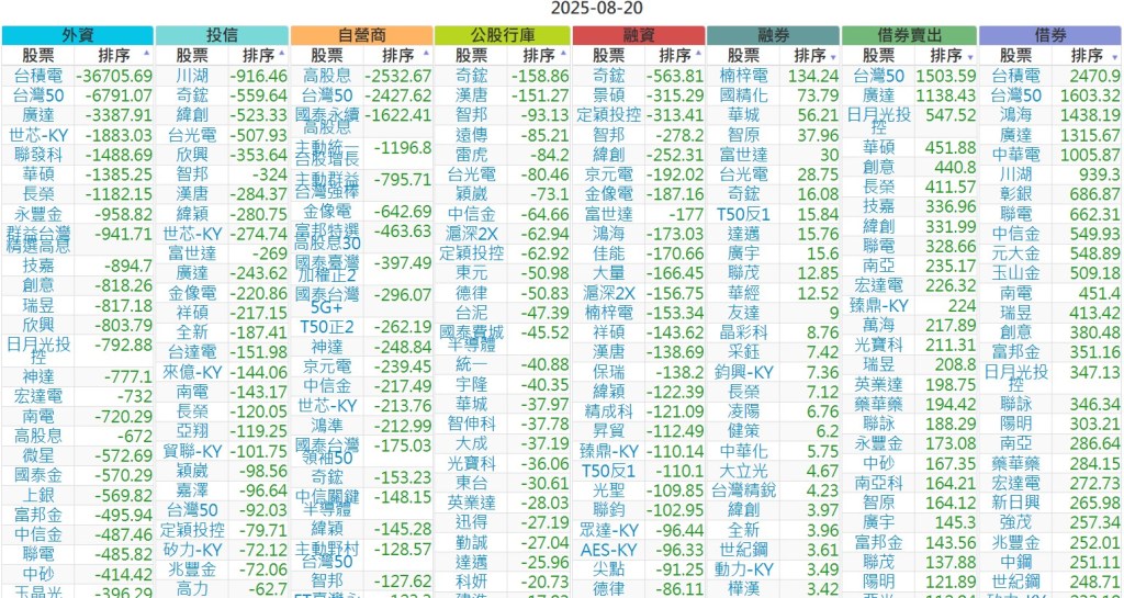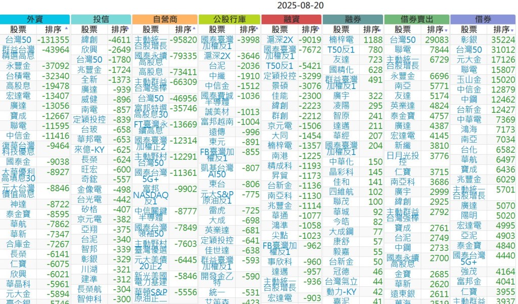 2025-0820【外資、投信】買賣超個股 2025-08-20 股狗網小編 投資誌-大盤 發表留言 上市:【外資、投信】買超(依金額) (單位:百萬) 上市:【外資、投信】賣超(依金額) (單位:百萬) 上市:【外資、投信】買超(依張數) (單位:張數) 上市:【外資、投信】賣超(依張數) (單位:張數) 免責宣言 本網站文章所提供資訊僅供參考,並無任何推介買賣之意,投資人應自行承擔交易風險。 分享此文: 按一下即可分享至 X(在新視窗中開啟) X 按一下以分享至 Facebook(在新視窗中開啟) Facebook 喜歡 正在載入...
