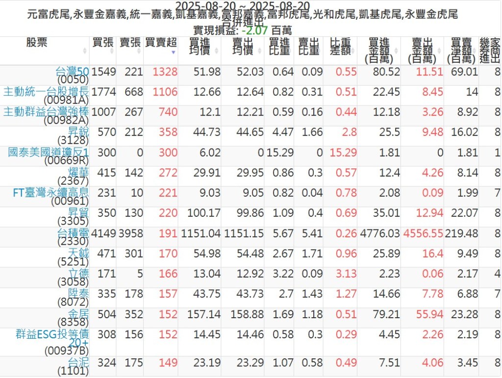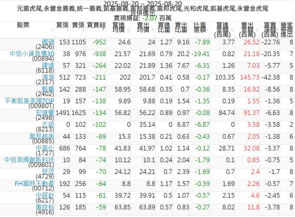 2025-0820主力買賣超個股 2025-08-20 股狗網小編 籌碼面每日資訊 發表留言 可參考下文 『如何查詢當沖、隔日沖分公司券商買賣』 主力當沖券商: 『元富虎尾』,『永豐金嘉義』,『統一嘉義』,『凱基嘉義』,『富邦嘉義』,『富邦虎尾』,『光和虎尾』,『凱基虎尾』,『永豐金虎尾』。 『當沖標的』 『買超股票』 『賣超股票』 免責宣言 本網站文章所提供資訊僅供參考,並無任何推介買賣之意,投資人應自行承擔交易風險。 分享此文: 按一下即可分享至 X(在新視窗中開啟) X 按一下以分享至 Facebook(在新視窗中開啟) Facebook 喜歡 正在載入...