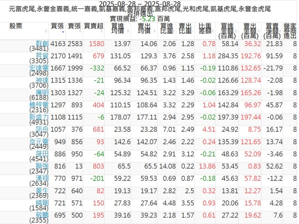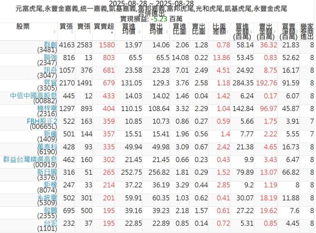 2025-0828主力買賣超個股 2025-08-28 股狗網小編 籌碼面每日資訊 發表留言 可參考下文 『如何查詢當沖、隔日沖分公司券商買賣』 主力當沖券商: 『元富虎尾』,『永豐金嘉義』,『統一嘉義』,『凱基嘉義』,『富邦嘉義』,『富邦虎尾』,『光和虎尾』,『凱基虎尾』,『永豐金虎尾』。 『當沖標的』 『買超股票』 『賣超股票』 免責宣言 本網站文章所提供資訊僅供參考,並無任何推介買賣之意,投資人應自行承擔交易風險。 分享此文: 按一下即可分享至 X(在新視窗中開啟) X 按一下以分享至 Facebook(在新視窗中開啟) Facebook 喜歡 正在載入...