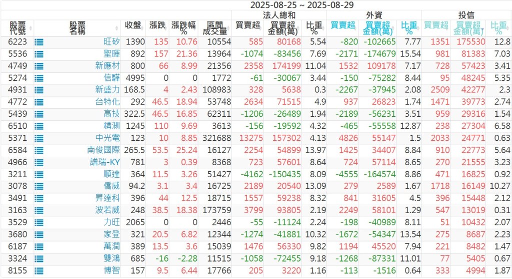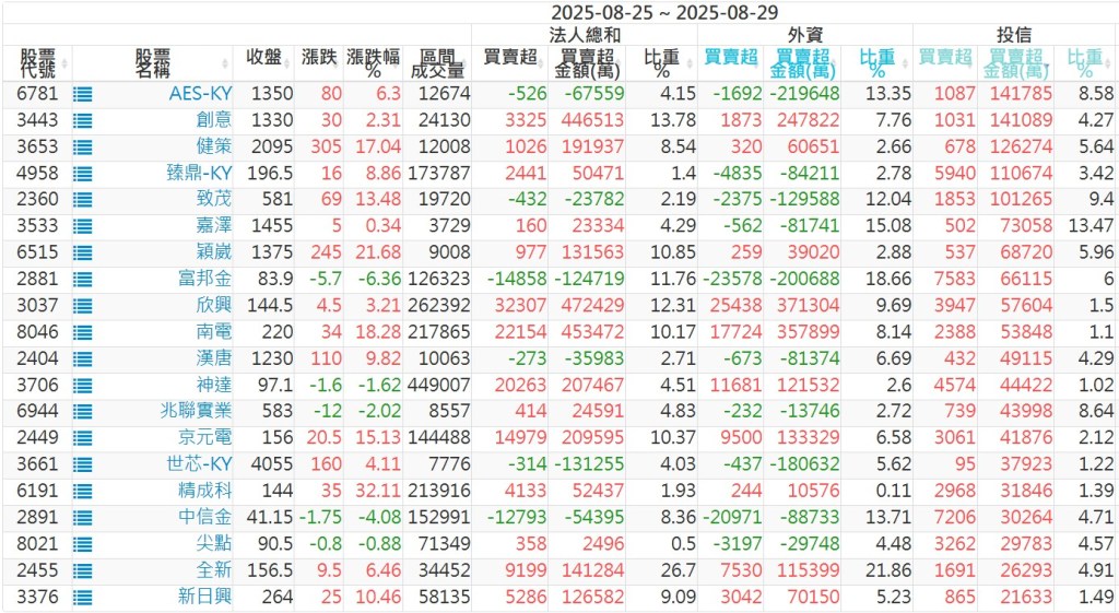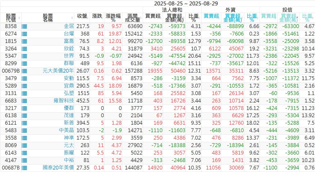 2025/08/25~2025/08/29近5日【投信】買賣超個股 2025-08-31 股狗網小編 投資誌-大盤 發表留言 【上市投信買超個股】(以金額排行,單位:萬) 【上市投信賣超個股】(以金額排行,單位:萬) 【上櫃投信買超個股】(以金額排行,單位:萬) 【上櫃投信賣超個股】(以金額排行,單位:萬) 免責宣言 本網站文章所提供資訊僅供參考,並無任何推介買賣之意,投資人應自行承擔交易風險。 分享此文: 按一下即可分享至 X(在新視窗中開啟) X 按一下以分享至 Facebook(在新視窗中開啟) Facebook 喜歡 正在載入...