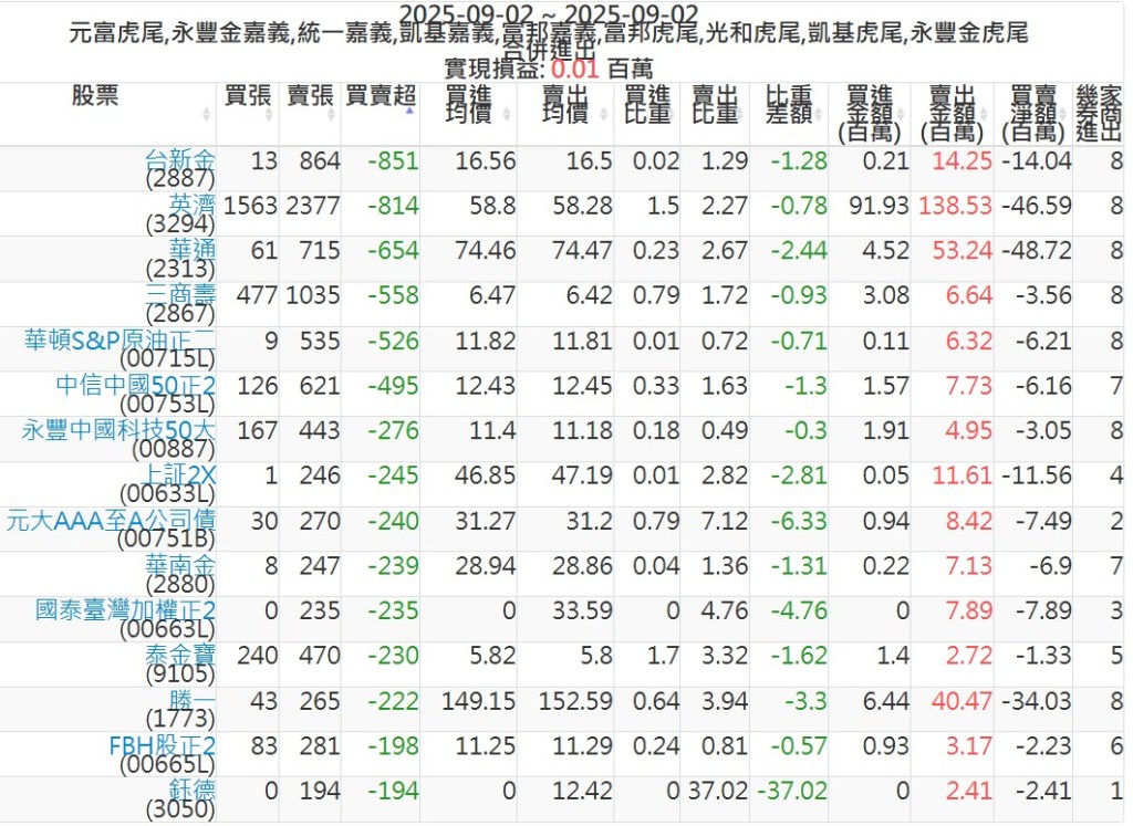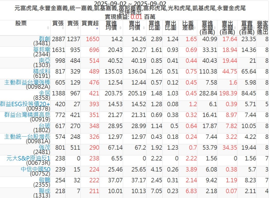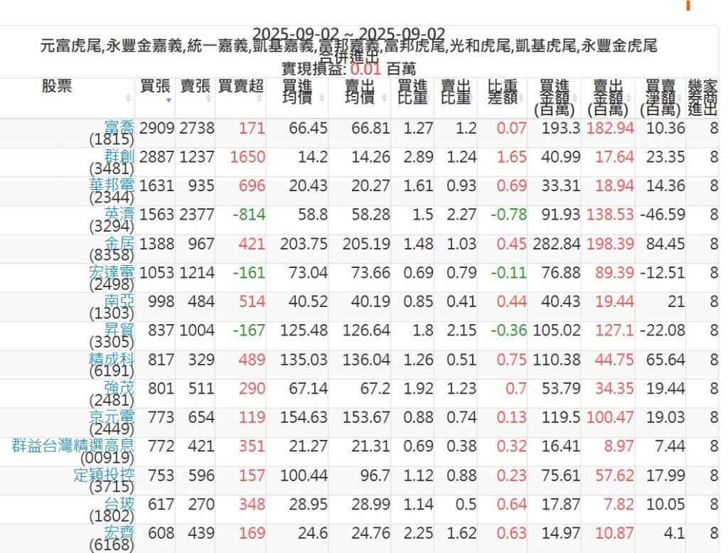 2025-0902主力買賣超個股 2025-09-02 股狗網小編 籌碼面每日資訊 發表留言 可參考下文 『如何查詢當沖、隔日沖分公司券商買賣』 主力當沖券商: 『元富虎尾』,『永豐金嘉義』,『統一嘉義』,『凱基嘉義』,『富邦嘉義』,『富邦虎尾』,『光和虎尾』,『凱基虎尾』,『永豐金虎尾』。 『當沖標的』 『買超股票』 『賣超股票』 免責宣言 本網站文章所提供資訊僅供參考,並無任何推介買賣之意,投資人應自行承擔交易風險。 分享此文: 按一下即可分享至 X(在新視窗中開啟) X 按一下以分享至 Facebook(在新視窗中開啟) Facebook 喜歡 正在載入...