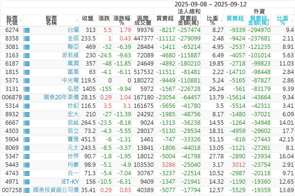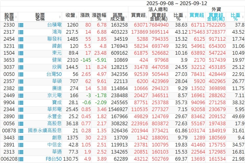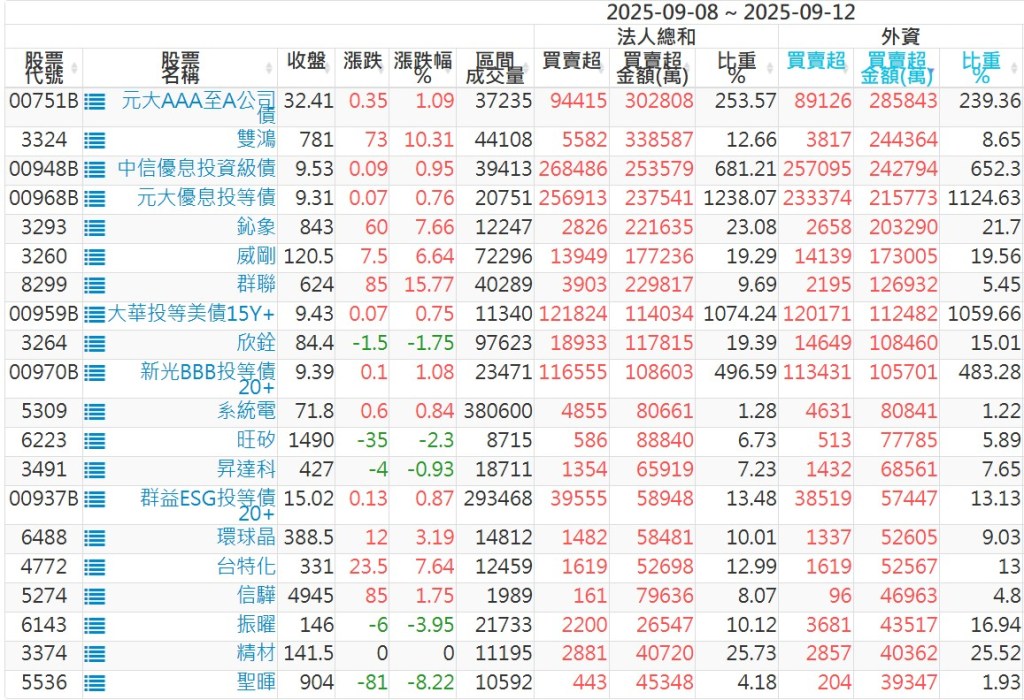 2025/09/08~2025/09/12近5日【外資】買賣超個股 2025-09-14 股狗網小編 投資誌-大盤 發表留言 外資本周累積【買超】約1574億元。 【上市外資買超個股】(以金額排行,單位:萬) 【上市外資賣超個股】(以金額排行,單位:萬) 【上櫃外資買超個股】(以金額排行,單位:萬) 【上櫃外資賣超個股】(以金額排行,單位:萬) 免責宣言 本網站文章所提供資訊僅供參考,並無任何推介買賣之意,投資人應自行承擔交易風險。 分享此文: 按一下即可分享至 X(在新視窗中開啟) X 按一下以分享至 Facebook(在新視窗中開啟) Facebook 喜歡 正在載入...