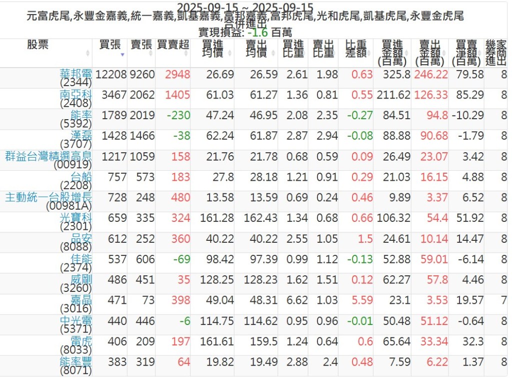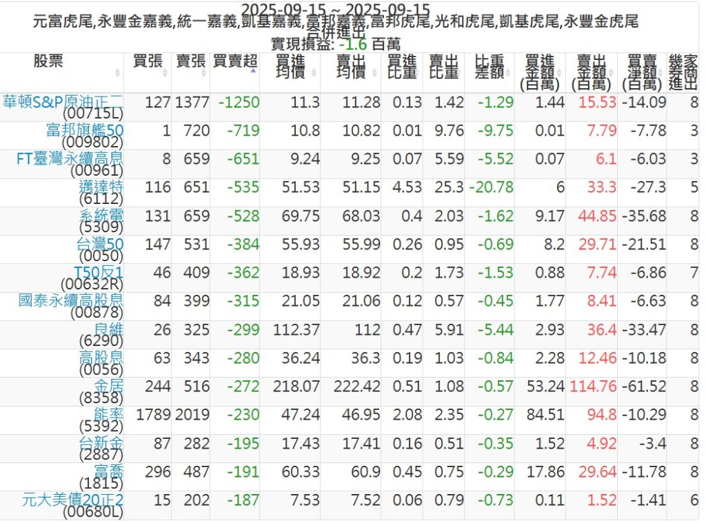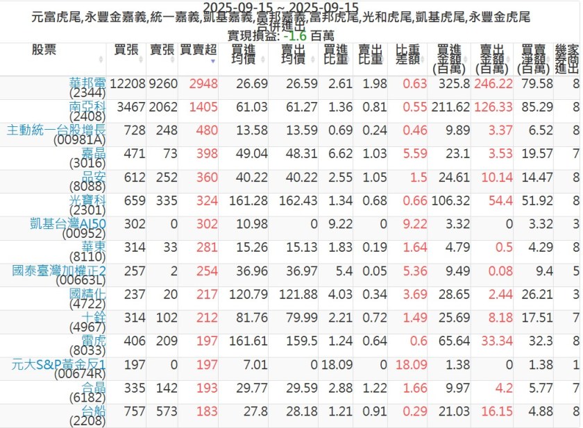 2025-0915主力買賣超個股 2025-09-15 股狗網小編 籌碼面每日資訊 發表留言 可參考下文 『如何查詢當沖、隔日沖分公司券商買賣』 主力當沖券商: 『元富虎尾』,『永豐金嘉義』,『統一嘉義』,『凱基嘉義』,『富邦嘉義』,『富邦虎尾』,『光和虎尾』,『凱基虎尾』,『永豐金虎尾』。 『當沖標的』 『買超股票』 『賣超股票』 免責宣言 本網站文章所提供資訊僅供參考,並無任何推介買賣之意,投資人應自行承擔交易風險。 分享此文: 按一下即可分享至 X(在新視窗中開啟) X 按一下以分享至 Facebook(在新視窗中開啟) Facebook 喜歡 正在載入...