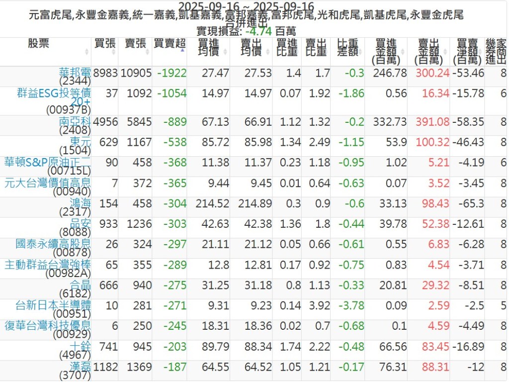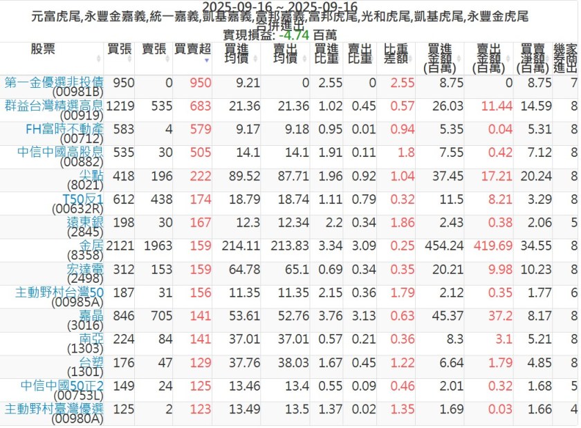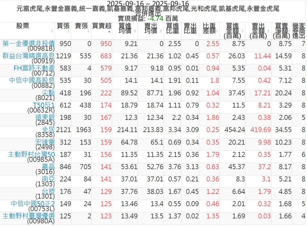 2025-0916主力買賣超個股 2025-09-16 股狗網小編 籌碼面每日資訊 發表留言 可參考下文 『如何查詢當沖、隔日沖分公司券商買賣』 主力當沖券商: 『元富虎尾』,『永豐金嘉義』,『統一嘉義』,『凱基嘉義』,『富邦嘉義』,『富邦虎尾』,『光和虎尾』,『凱基虎尾』,『永豐金虎尾』。 『當沖標的』 『買超股票』 『賣超股票』 免責宣言 本網站文章所提供資訊僅供參考,並無任何推介買賣之意,投資人應自行承擔交易風險。 分享此文: 按一下即可分享至 X(在新視窗中開啟) X 按一下以分享至 Facebook(在新視窗中開啟) Facebook 喜歡 正在載入...