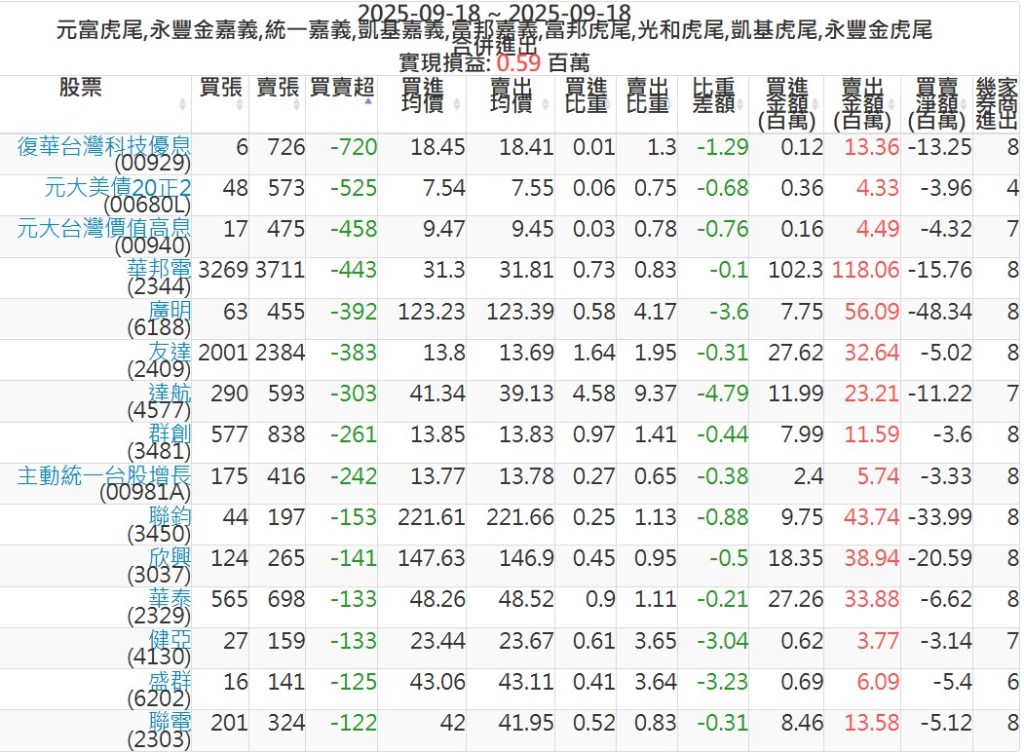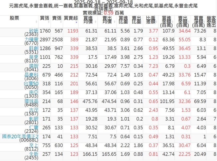 2025-0918主力買賣超個股 2025-09-18 股狗網小編 籌碼面每日資訊 發表留言 可參考下文 『如何查詢當沖、隔日沖分公司券商買賣』 主力當沖券商: 『元富虎尾』,『永豐金嘉義』,『統一嘉義』,『凱基嘉義』,『富邦嘉義』,『富邦虎尾』,『光和虎尾』,『凱基虎尾』,『永豐金虎尾』。 『當沖標的』 『買超股票』 『賣超股票』 免責宣言 本網站文章所提供資訊僅供參考,並無任何推介買賣之意,投資人應自行承擔交易風險。 分享此文: 按一下即可分享至 X(在新視窗中開啟) X 按一下以分享至 Facebook(在新視窗中開啟) Facebook 喜歡 正在載入...