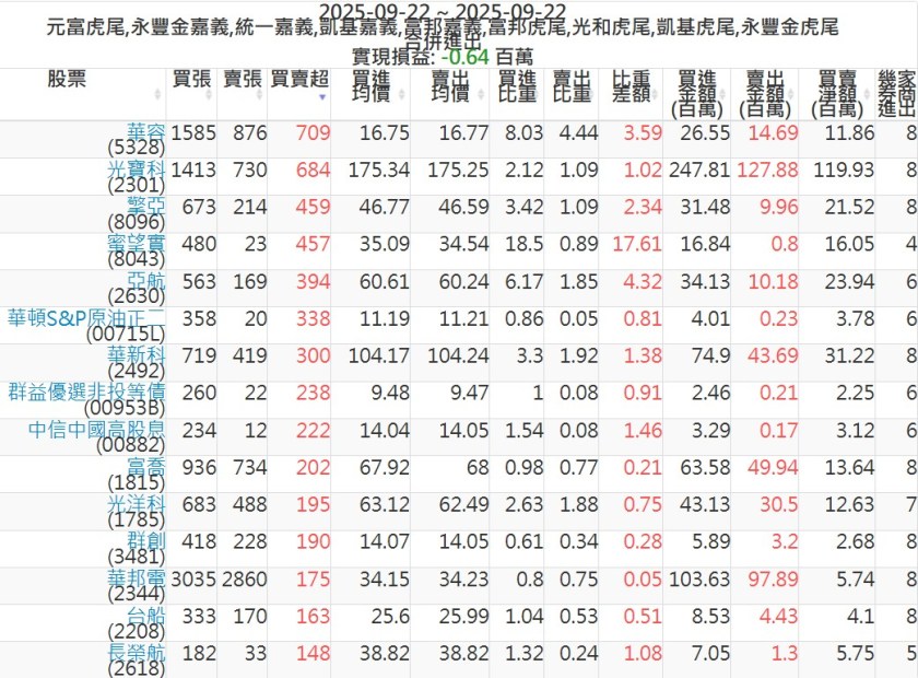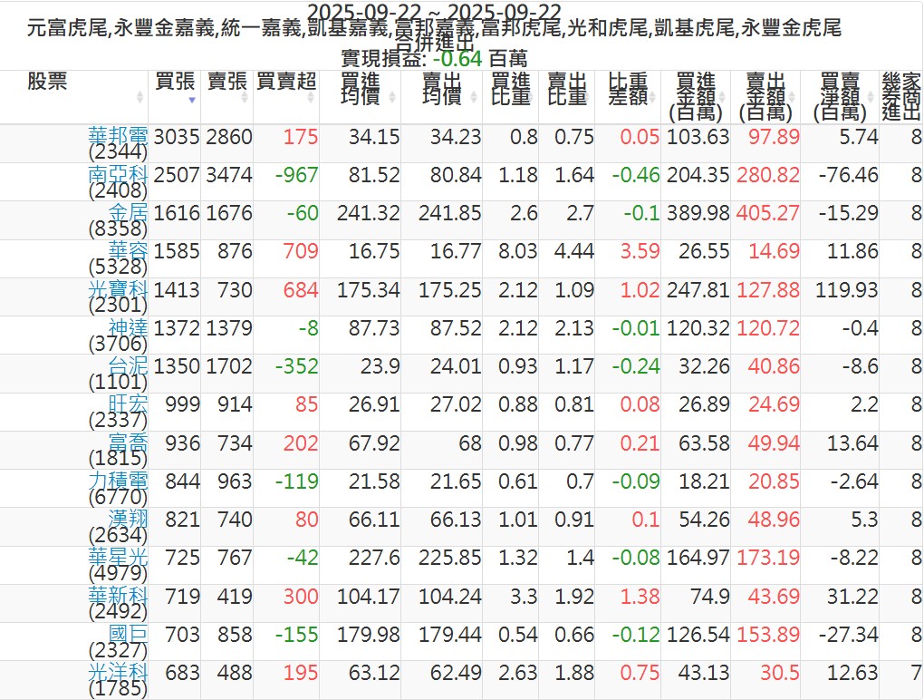 2025-0922主力買賣超個股 2025-09-23 股狗網小編 籌碼面每日資訊 發表留言 可參考下文 『如何查詢當沖、隔日沖分公司券商買賣』 主力當沖券商: 『元富虎尾』,『永豐金嘉義』,『統一嘉義』,『凱基嘉義』,『富邦嘉義』,『富邦虎尾』,『光和虎尾』,『凱基虎尾』,『永豐金虎尾』。 『當沖標的』 『買超股票』 『賣超股票』 免責宣言 本網站文章所提供資訊僅供參考,並無任何推介買賣之意,投資人應自行承擔交易風險。 分享此文: 按一下即可分享至 X(在新視窗中開啟) X 按一下以分享至 Facebook(在新視窗中開啟) Facebook 喜歡 正在載入...