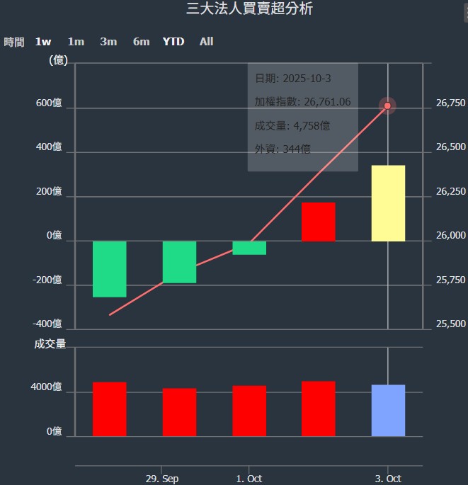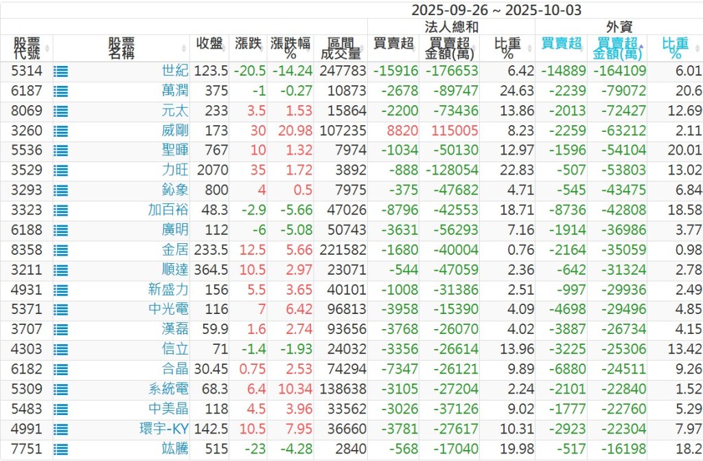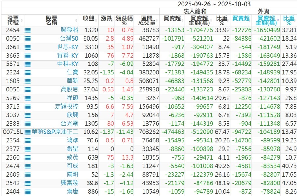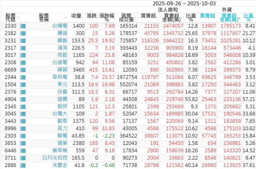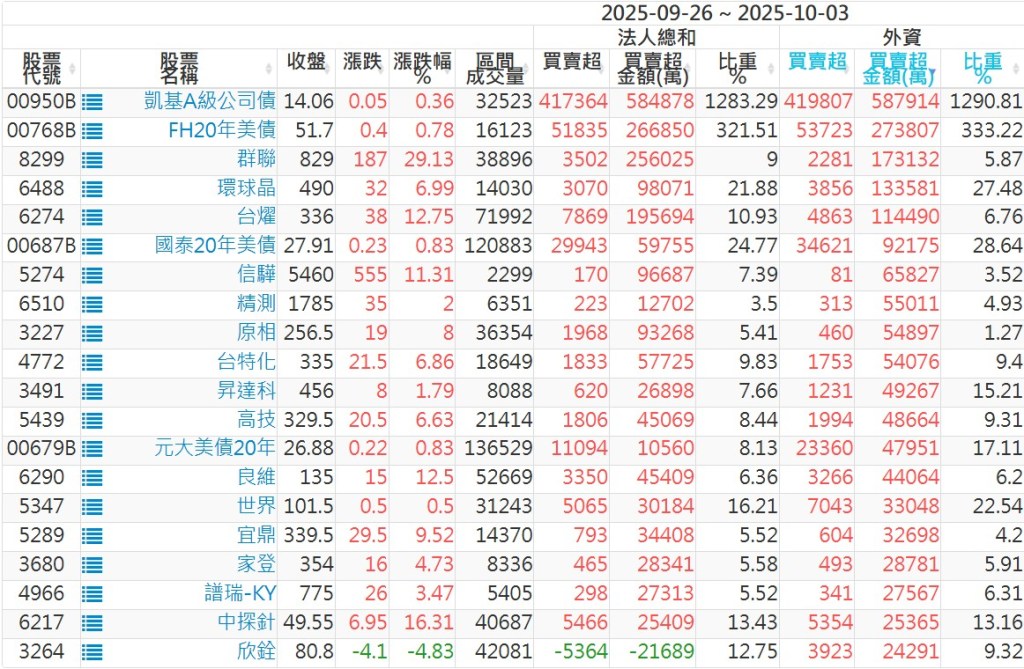 2025/09/26~2025/10/03近5日【外資】買賣超個股 2025-10-05 股狗網小編 投資誌-大盤 發表留言 外資本周累積【買超】約344億元。 【上市外資買超個股】(以金額排行,單位:萬) 【上市外資賣超個股】(以金額排行,單位:萬) 【上櫃外資買超個股】(以金額排行,單位:萬) 【上櫃外資賣超個股】(以金額排行,單位:萬) 免責宣言 本網站文章所提供資訊僅供參考,並無任何推介買賣之意,投資人應自行承擔交易風險。 分享此文: 按一下即可分享至 X(在新視窗中開啟) X 按一下以分享至 Facebook(在新視窗中開啟) Facebook 喜歡 正在載入...
