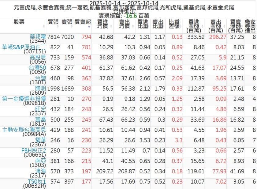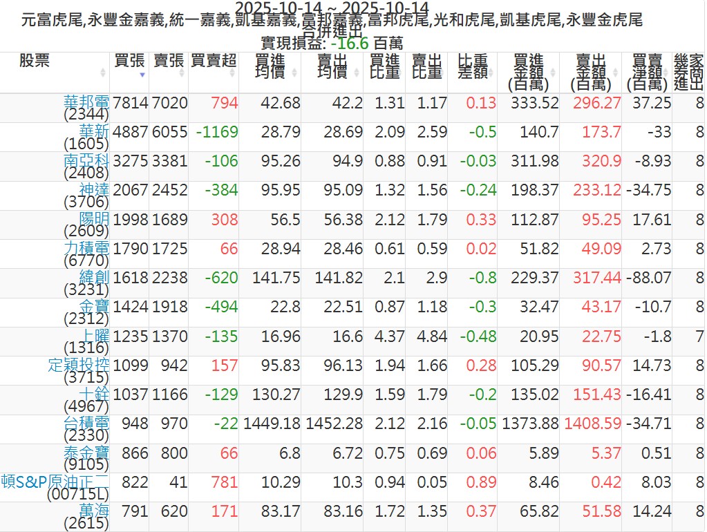 2025-1014主力買賣超個股 2025-10-14 股狗網小編 籌碼面每日資訊 發表留言 可參考下文 『如何查詢當沖、隔日沖分公司券商買賣』 主力當沖券商: 『元富虎尾』,『永豐金嘉義』,『統一嘉義』,『凱基嘉義』,『富邦嘉義』,『富邦虎尾』,『光和虎尾』,『凱基虎尾』,『永豐金虎尾』。 『當沖標的』 『買超股票』 『賣超股票』 免責宣言 本網站文章所提供資訊僅供參考,並無任何推介買賣之意,投資人應自行承擔交易風險。 分享此文: 按一下即可分享至 X(在新視窗中開啟) X 按一下以分享至 Facebook(在新視窗中開啟) Facebook 喜歡 正在載入...