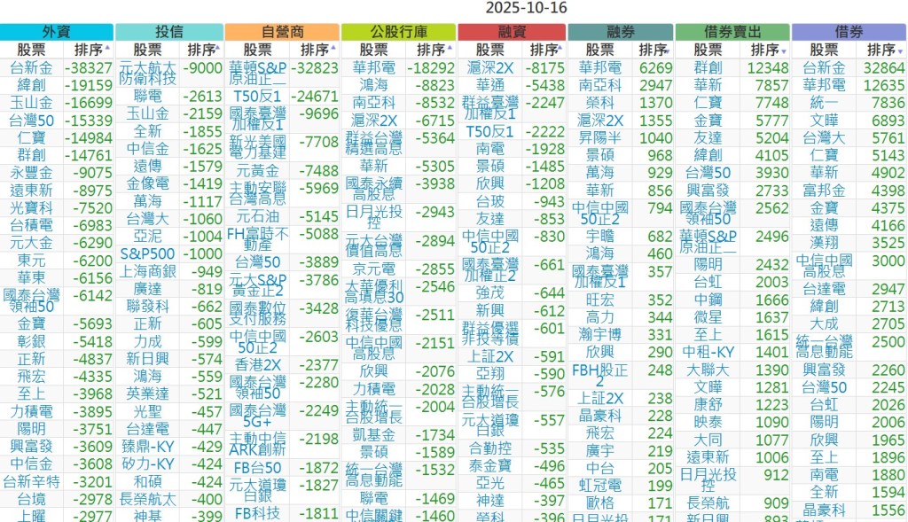 2025-1016【外資、投信】買賣超個股 2025-10-16 股狗網小編 投資誌-大盤 發表留言 上市:【外資、投信】買超(依金額) (單位:百萬) 上市:【外資、投信】賣超(依金額) (單位:百萬) 上市:【外資、投信】買超(依張數) (單位:張數) 上市:【外資、投信】賣超(依張數) (單位:張數) 免責宣言 本網站文章所提供資訊僅供參考,並無任何推介買賣之意,投資人應自行承擔交易風險。 分享此文: 按一下即可分享至 X(在新視窗中開啟) X 按一下以分享至 Facebook(在新視窗中開啟) Facebook 喜歡 正在載入...