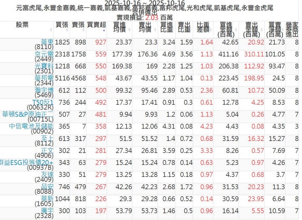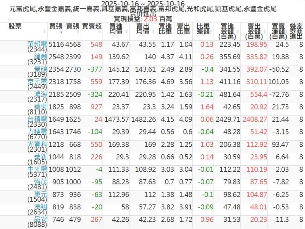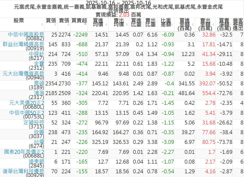 2025-1016主力買賣超個股 2025-10-16 股狗網小編 籌碼面每日資訊 發表留言 可參考下文 『如何查詢當沖、隔日沖分公司券商買賣』 主力當沖券商: 『元富虎尾』,『永豐金嘉義』,『統一嘉義』,『凱基嘉義』,『富邦嘉義』,『富邦虎尾』,『光和虎尾』,『凱基虎尾』,『永豐金虎尾』。 『當沖標的』 『買超股票』 『賣超股票』 免責宣言 本網站文章所提供資訊僅供參考,並無任何推介買賣之意,投資人應自行承擔交易風險。 分享此文: 按一下即可分享至 X(在新視窗中開啟) X 按一下以分享至 Facebook(在新視窗中開啟) Facebook 喜歡 正在載入...