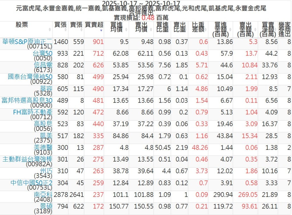 2025-1017主力買賣超個股 2025-10-17 股狗網小編 籌碼面每日資訊 發表留言 可參考下文 『如何查詢當沖、隔日沖分公司券商買賣』 主力當沖券商: 『元富虎尾』,『永豐金嘉義』,『統一嘉義』,『凱基嘉義』,『富邦嘉義』,『富邦虎尾』,『光和虎尾』,『凱基虎尾』,『永豐金虎尾』。 『當沖標的』 『買超股票』 『賣超股票』 免責宣言 本網站文章所提供資訊僅供參考,並無任何推介買賣之意,投資人應自行承擔交易風險。 分享此文: 按一下即可分享至 X(在新視窗中開啟) X 按一下以分享至 Facebook(在新視窗中開啟) Facebook 喜歡 正在載入...