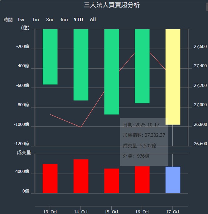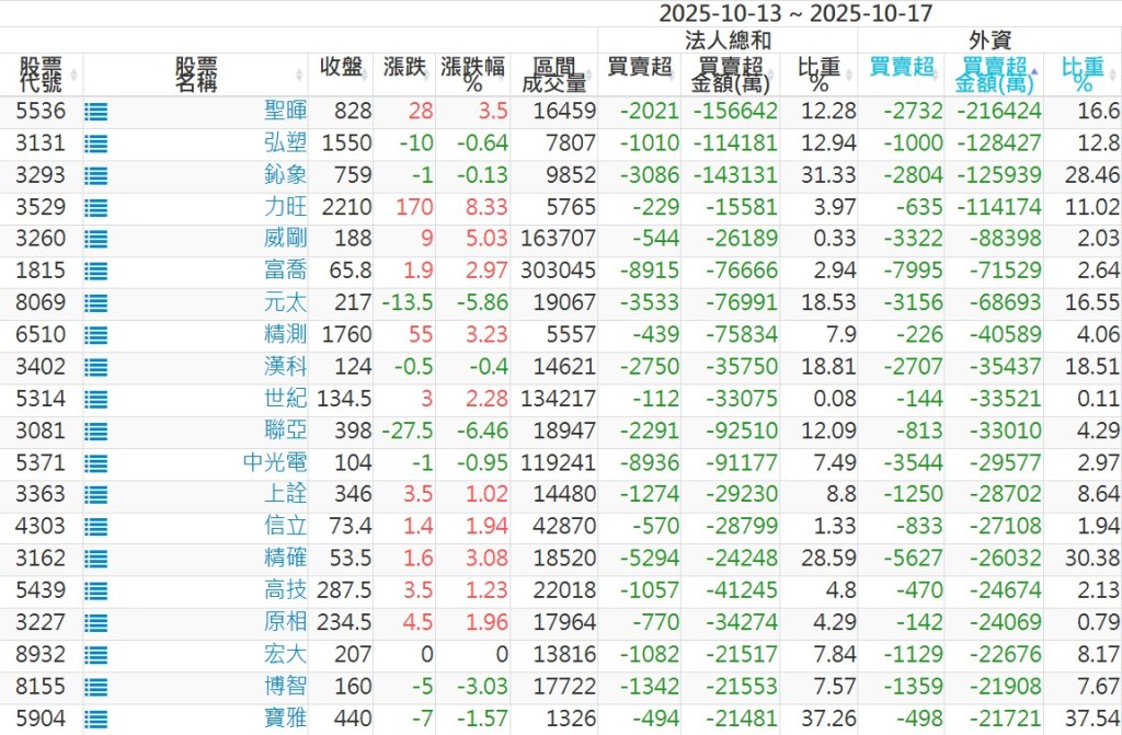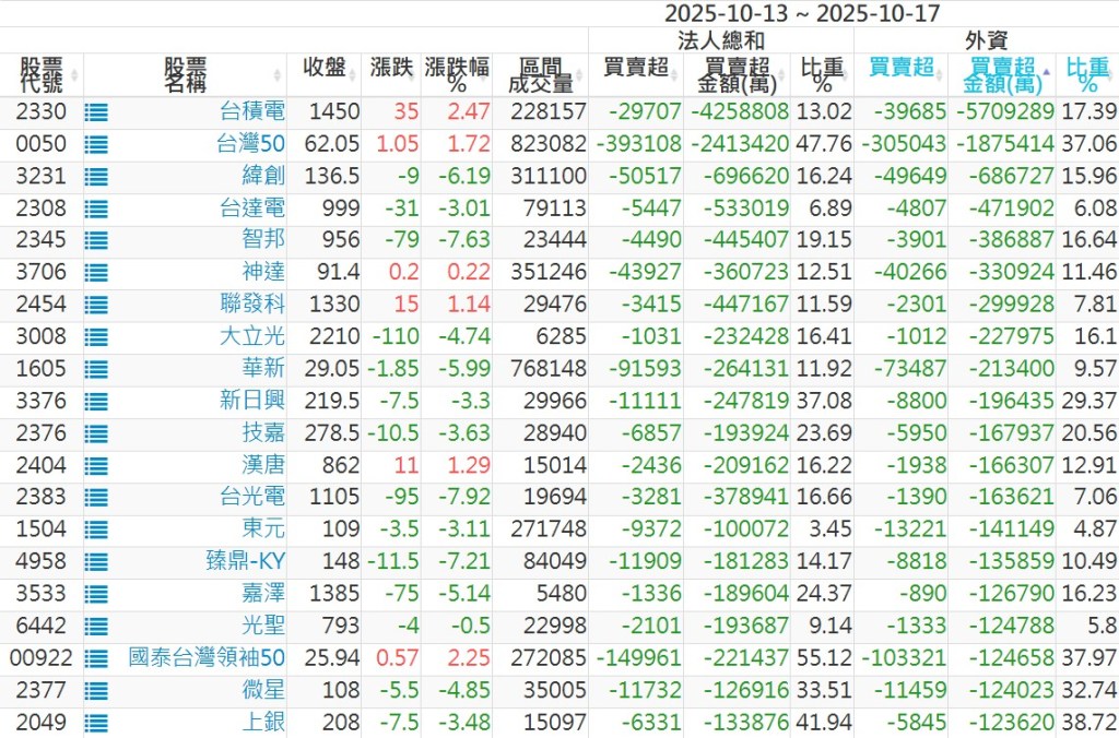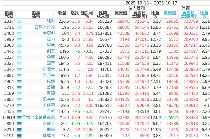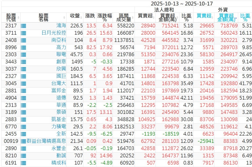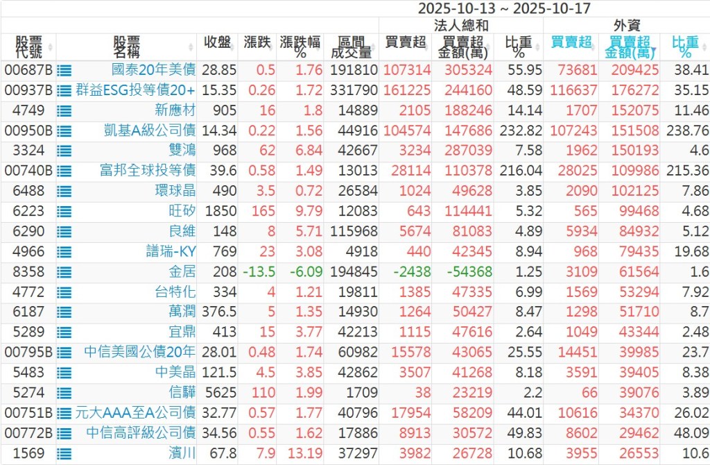 2025/10/13~2025/10/17近5日【外資】買賣超個股 2025-10-19 股狗網小編 投資誌-大盤 發表留言 外資本周累積【賣超】約976億元。 【上市外資買超個股】(以金額排行,單位:萬) 【上市外資賣超個股】(以金額排行,單位:萬) 【上櫃外資買超個股】(以金額排行,單位:萬) 【上櫃外資賣超個股】(以金額排行,單位:萬) 免責宣言 本網站文章所提供資訊僅供參考,並無任何推介買賣之意,投資人應自行承擔交易風險。 分享此文: 按一下即可分享至 X(在新視窗中開啟) X 按一下以分享至 Facebook(在新視窗中開啟) Facebook 喜歡 正在載入...
