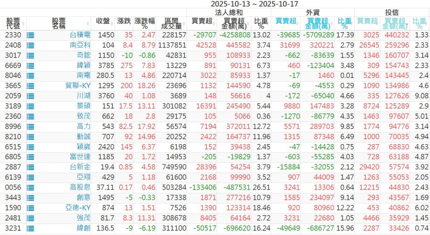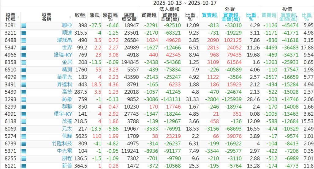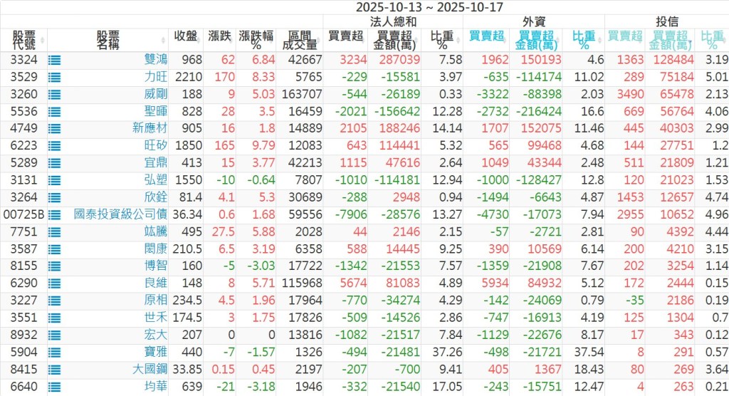 2025/10/13~2025/10/17近5日【投信】買賣超個股 2025-10-19 股狗網小編 投資誌-大盤 發表留言 【上市投信買超個股】(以金額排行,單位:萬) 【上市投信賣超個股】(以金額排行,單位:萬) 【上櫃投信買超個股】(以金額排行,單位:萬) 【上櫃投信賣超個股】(以金額排行,單位:萬) 免責宣言 本網站文章所提供資訊僅供參考,並無任何推介買賣之意,投資人應自行承擔交易風險。 分享此文: 按一下即可分享至 X(在新視窗中開啟) X 按一下以分享至 Facebook(在新視窗中開啟) Facebook 喜歡 正在載入...