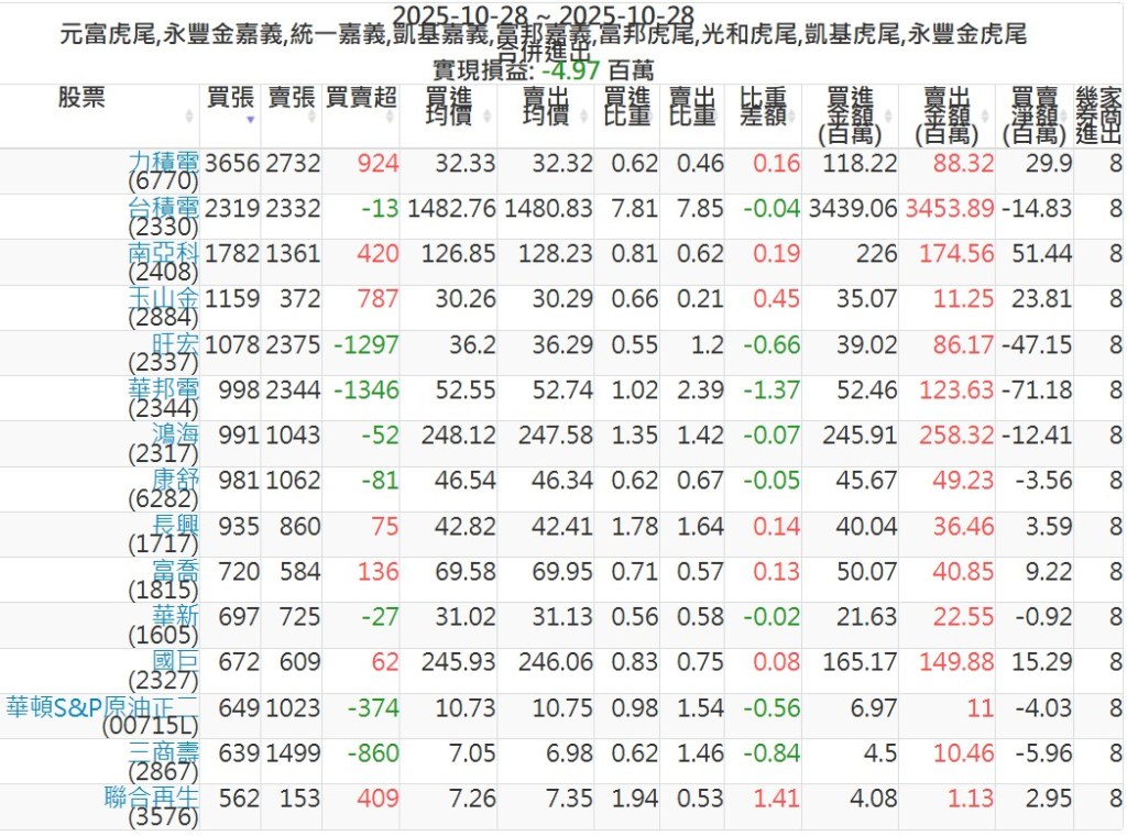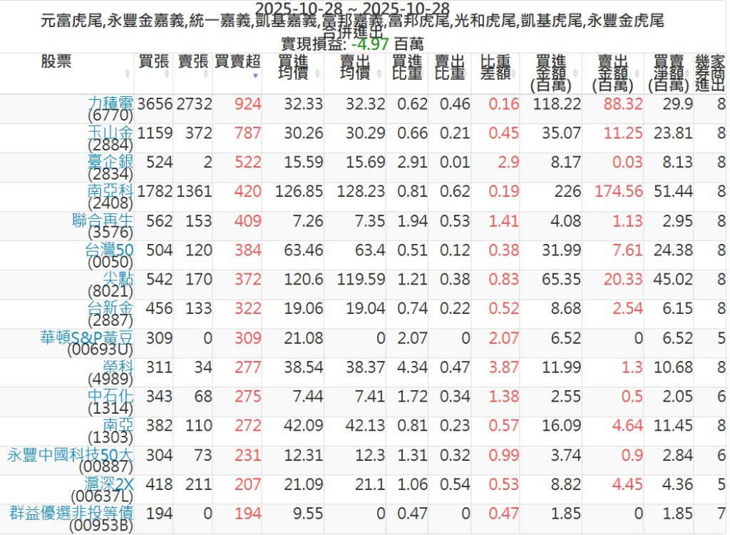 2025-1028主力買賣超個股 2025-10-28 股狗網小編 籌碼面每日資訊 發表留言 可參考下文 『如何查詢當沖、隔日沖分公司券商買賣』 主力當沖券商: 『元富虎尾』,『永豐金嘉義』,『統一嘉義』,『凱基嘉義』,『富邦嘉義』,『富邦虎尾』,『光和虎尾』,『凱基虎尾』,『永豐金虎尾』。 『當沖標的』 『買超股票』 『賣超股票』 免責宣言 本網站文章所提供資訊僅供參考,並無任何推介買賣之意,投資人應自行承擔交易風險。 分享此文: 按一下即可分享至 X(在新視窗中開啟) X 按一下以分享至 Facebook(在新視窗中開啟) Facebook 喜歡 正在載入...