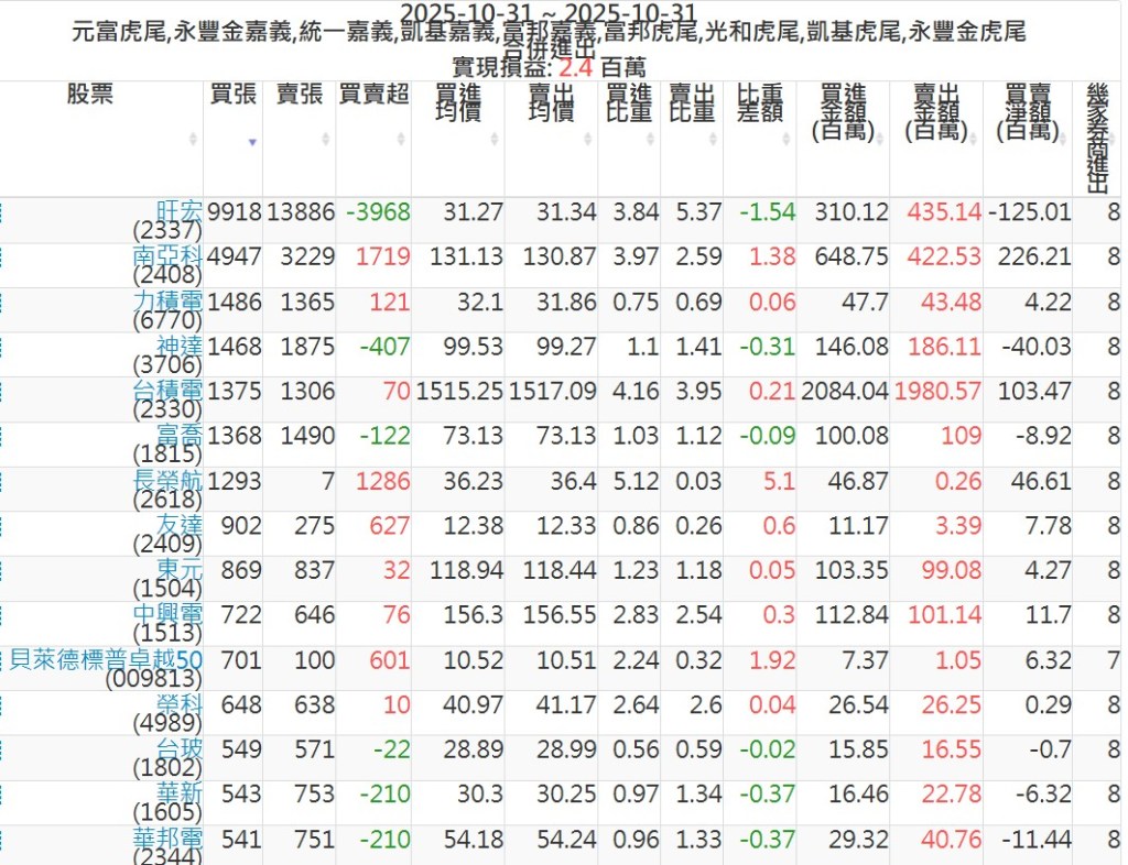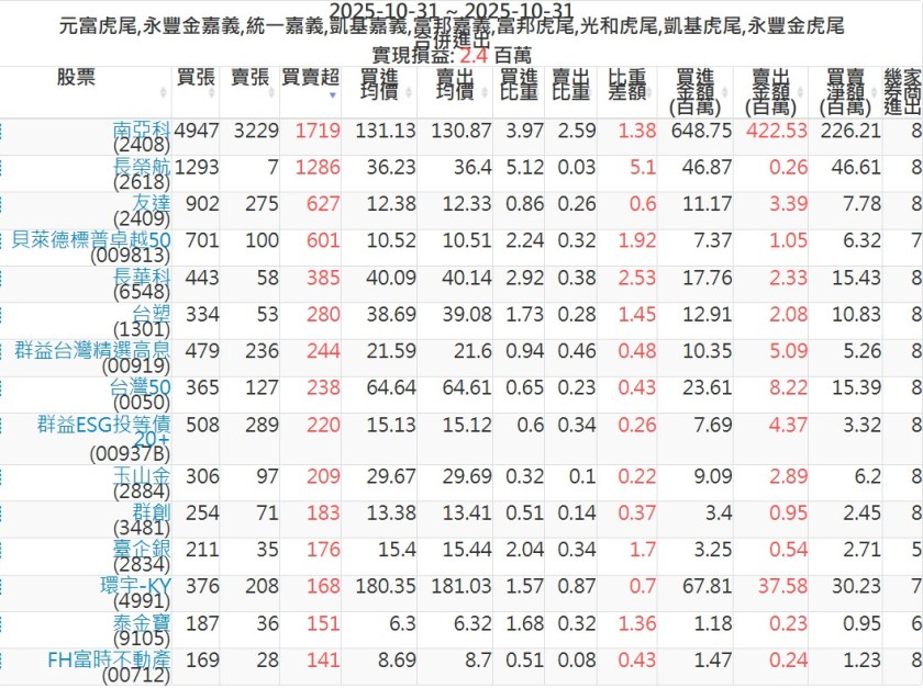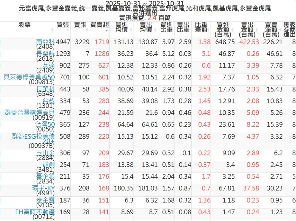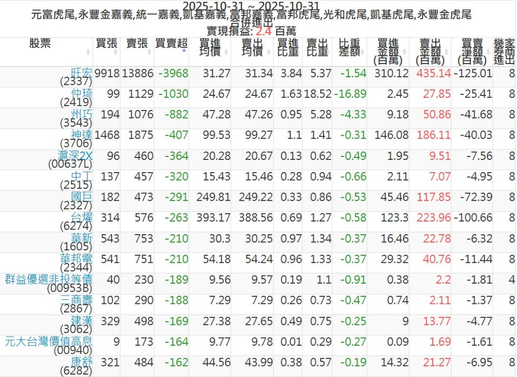 2025-1031主力買賣超個股 2025-10-31 股狗網小編 籌碼面每日資訊 發表留言 可參考下文 『如何查詢當沖、隔日沖分公司券商買賣』 主力當沖券商: 『元富虎尾』,『永豐金嘉義』,『統一嘉義』,『凱基嘉義』,『富邦嘉義』,『富邦虎尾』,『光和虎尾』,『凱基虎尾』,『永豐金虎尾』。 『當沖標的』 『買超股票』 『賣超股票』 免責宣言 本網站文章所提供資訊僅供參考,並無任何推介買賣之意,投資人應自行承擔交易風險。 分享此文: 按一下即可分享至 X(在新視窗中開啟) X 按一下以分享至 Facebook(在新視窗中開啟) Facebook 喜歡 正在載入...