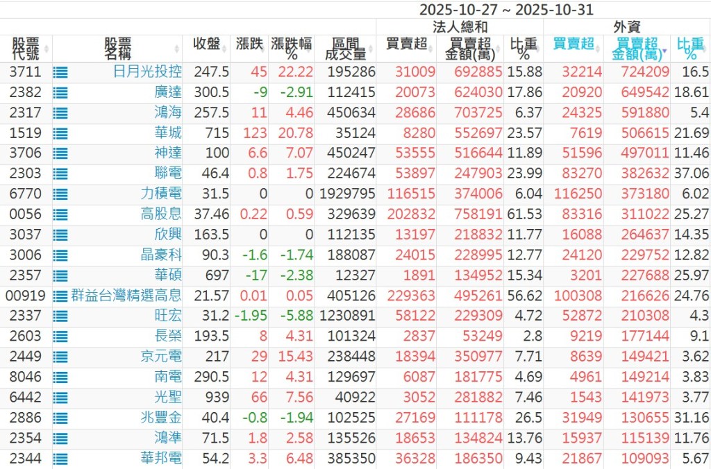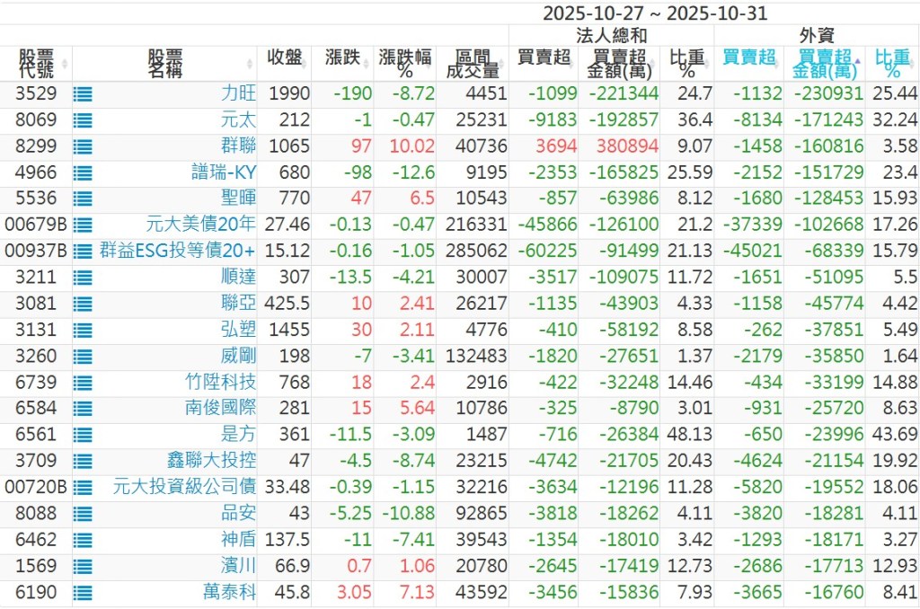 2025/10/27~2025/10/31近5日【外資】買賣超個股 2025-11-02 股狗網小編 投資誌-大盤 發表留言 外資本周累積【賣超】約140億元。 【上市外資買超個股】(以金額排行,單位:萬) 【上市外資賣超個股】(以金額排行,單位:萬) 【上櫃外資買超個股】(以金額排行,單位:萬) 【上櫃外資賣超個股】(以金額排行,單位:萬) 免責宣言 本網站文章所提供資訊僅供參考,並無任何推介買賣之意,投資人應自行承擔交易風險。 分享此文: 按一下即可分享至 X(在新視窗中開啟) X 按一下以分享至 Facebook(在新視窗中開啟) Facebook 喜歡 正在載入...