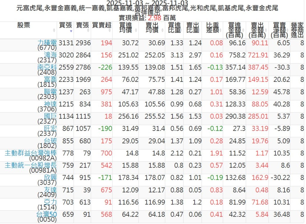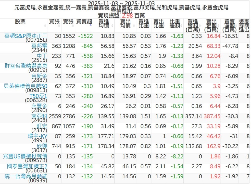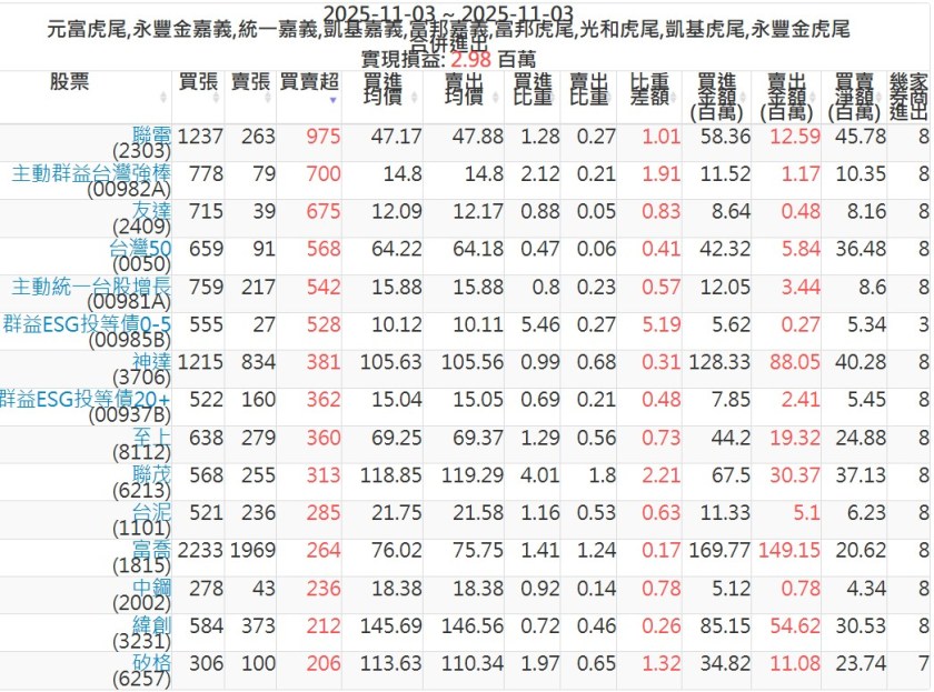 2025-1103主力買賣超個股 2025-11-03 股狗網小編 籌碼面每日資訊 發表留言 可參考下文 『如何查詢當沖、隔日沖分公司券商買賣』 主力當沖券商: 『元富虎尾』,『永豐金嘉義』,『統一嘉義』,『凱基嘉義』,『富邦嘉義』,『富邦虎尾』,『光和虎尾』,『凱基虎尾』,『永豐金虎尾』。 『當沖標的』 『買超股票』 『賣超股票』 免責宣言 本網站文章所提供資訊僅供參考,並無任何推介買賣之意,投資人應自行承擔交易風險。 分享此文: 按一下即可分享至 X(在新視窗中開啟) X 按一下以分享至 Facebook(在新視窗中開啟) Facebook 喜歡 正在載入...