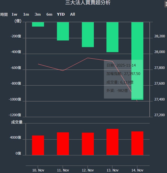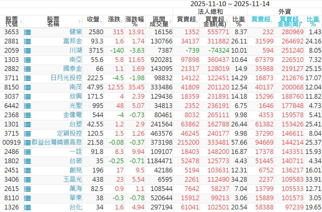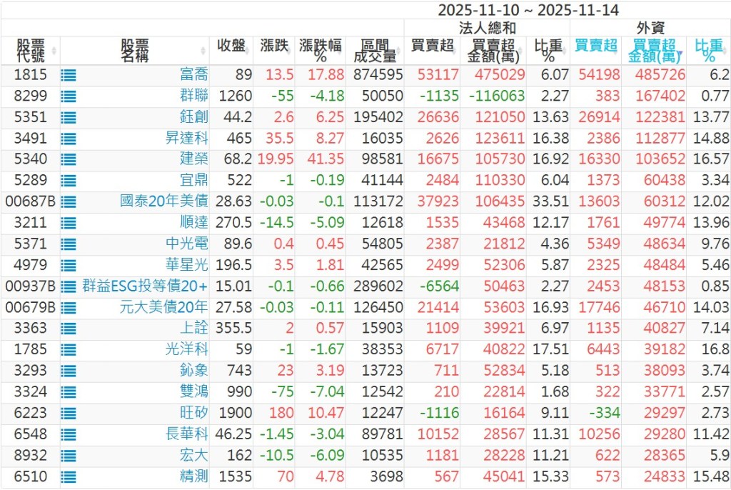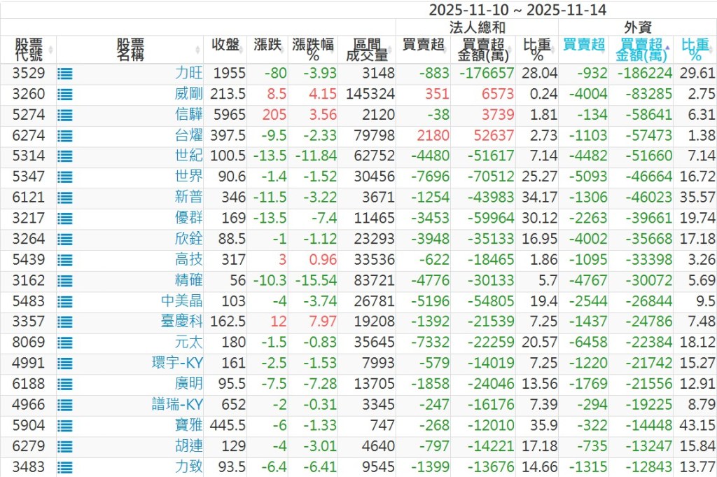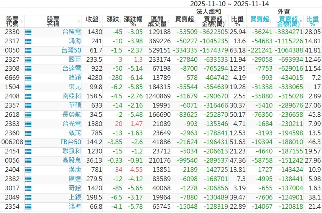 2025/11/10~2025/11/14近5日【外資】買賣超個股 2025-11-16 股狗網小編 投資誌-大盤 發表留言 外資本周累積【賣超】約982億元。 【上市外資買超個股】(以金額排行,單位:萬) 【上市外資賣超個股】(以金額排行,單位:萬) 【上櫃外資買超個股】(以金額排行,單位:萬) 【上櫃外資賣超個股】(以金額排行,單位:萬) 免責宣言 本網站文章所提供資訊僅供參考,並無任何推介買賣之意,投資人應自行承擔交易風險。 分享此文: 按一下即可分享至 X(在新視窗中開啟) X 按一下以分享至 Facebook(在新視窗中開啟) Facebook 喜歡 正在載入...