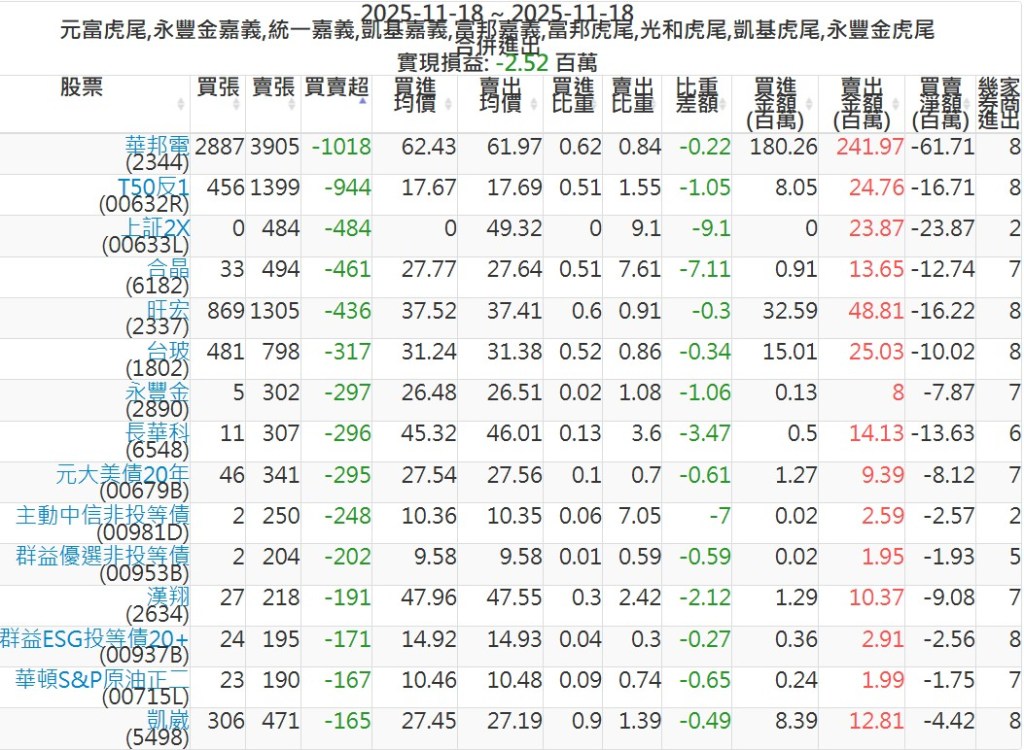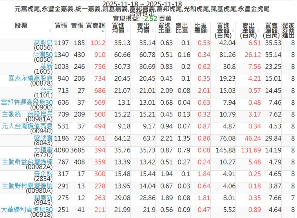 2025-1118主力買賣超個股 2025-11-18 股狗網小編 籌碼面每日資訊 發表留言 可參考下文 『如何查詢當沖、隔日沖分公司券商買賣』 主力當沖券商: 『元富虎尾』,『永豐金嘉義』,『統一嘉義』,『凱基嘉義』,『富邦嘉義』,『富邦虎尾』,『光和虎尾』,『凱基虎尾』,『永豐金虎尾』。 『當沖標的』 『買超股票』 『賣超股票』 免責宣言 本網站文章所提供資訊僅供參考,並無任何推介買賣之意,投資人應自行承擔交易風險。 分享此文: 按一下即可分享至 X(在新視窗中開啟) X 按一下以分享至 Facebook(在新視窗中開啟) Facebook 喜歡 正在載入...