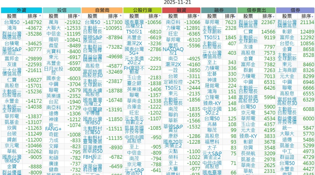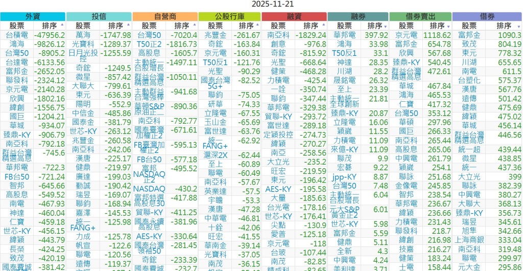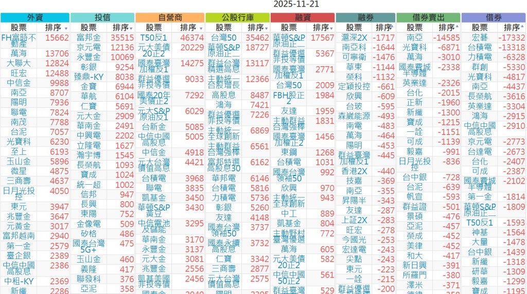 2025-1121【外資、投信】買賣超個股 2025-11-21 股狗網小編 投資誌-大盤 發表留言 上市:【外資、投信】買超(依金額) (單位:百萬) 上市:【外資、投信】賣超(依金額) (單位:百萬) 上市:【外資、投信】買超(依張數) (單位:張數) 上市:【外資、投信】賣超(依張數) (單位:張數) 免責宣言 本網站文章所提供資訊僅供參考,並無任何推介買賣之意,投資人應自行承擔交易風險。 分享此文: 按一下即可分享至 X(在新視窗中開啟) X 按一下以分享至 Facebook(在新視窗中開啟) Facebook 喜歡 正在載入...