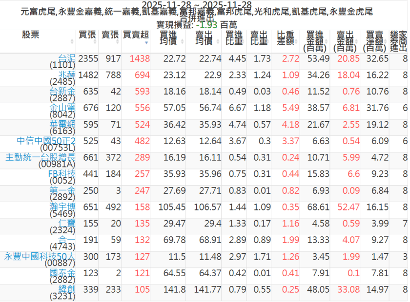 2025-1128主力買賣超個股 2025-11-28 股狗網小編 籌碼面每日資訊 發表留言 可參考下文 『如何查詢當沖、隔日沖分公司券商買賣』 主力當沖券商: 『元富虎尾』,『永豐金嘉義』,『統一嘉義』,『凱基嘉義』,『富邦嘉義』,『富邦虎尾』,『光和虎尾』,『凱基虎尾』,『永豐金虎尾』。 『當沖標的』 『買超股票』 『賣超股票』 免責宣言 本網站文章所提供資訊僅供參考,並無任何推介買賣之意,投資人應自行承擔交易風險。 分享此文: 按一下即可分享至 X(在新視窗中開啟) X 按一下以分享至 Facebook(在新視窗中開啟) Facebook 喜歡 正在載入...