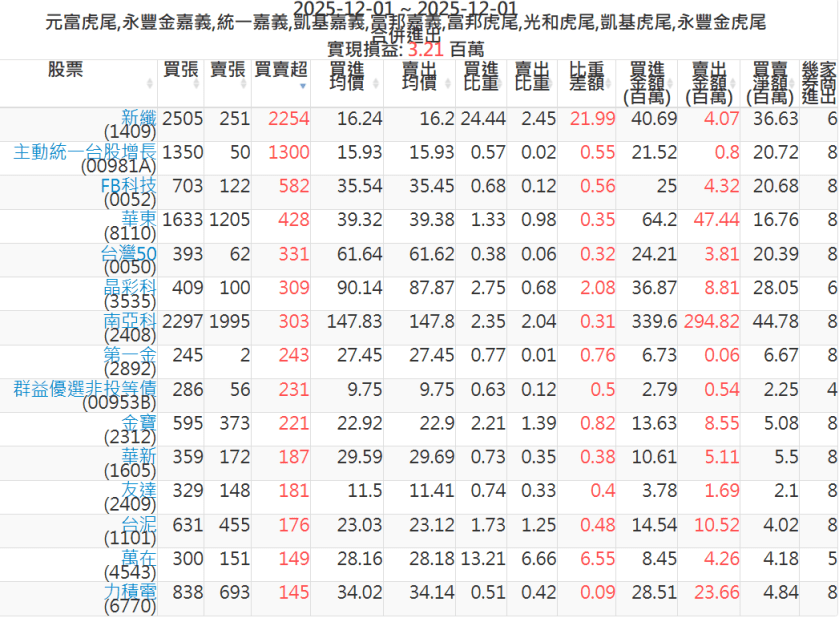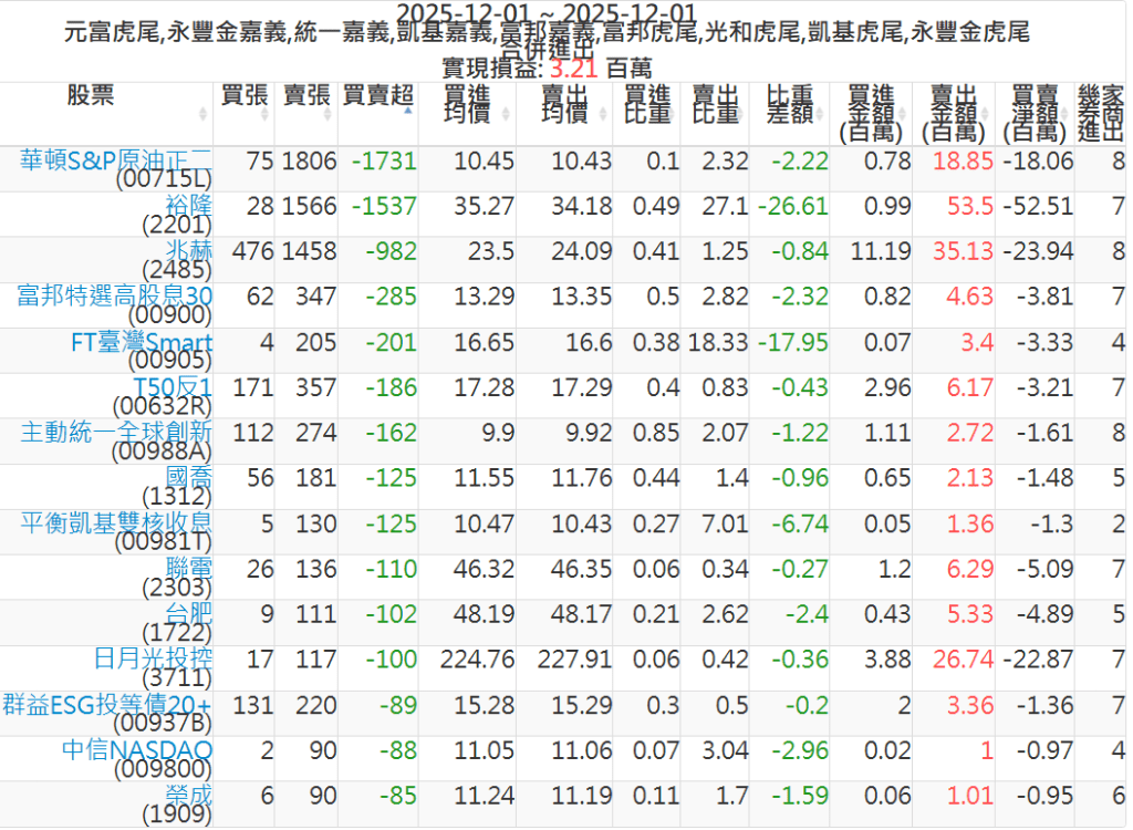 2025-1201主力買賣超個股 2025-12-01 股狗網小編 籌碼面每日資訊 發表留言 可參考下文 『如何查詢當沖、隔日沖分公司券商買賣』 主力當沖券商: 『元富虎尾』,『永豐金嘉義』,『統一嘉義』,『凱基嘉義』,『富邦嘉義』,『富邦虎尾』,『光和虎尾』,『凱基虎尾』,『永豐金虎尾』。 『當沖標的』 『買超股票』 『賣超股票』 免責宣言 本網站文章所提供資訊僅供參考,並無任何推介買賣之意,投資人應自行承擔交易風險。 分享此文: 按一下即可分享至 X(在新視窗中開啟) X 按一下以分享至 Facebook(在新視窗中開啟) Facebook 喜歡 正在載入...