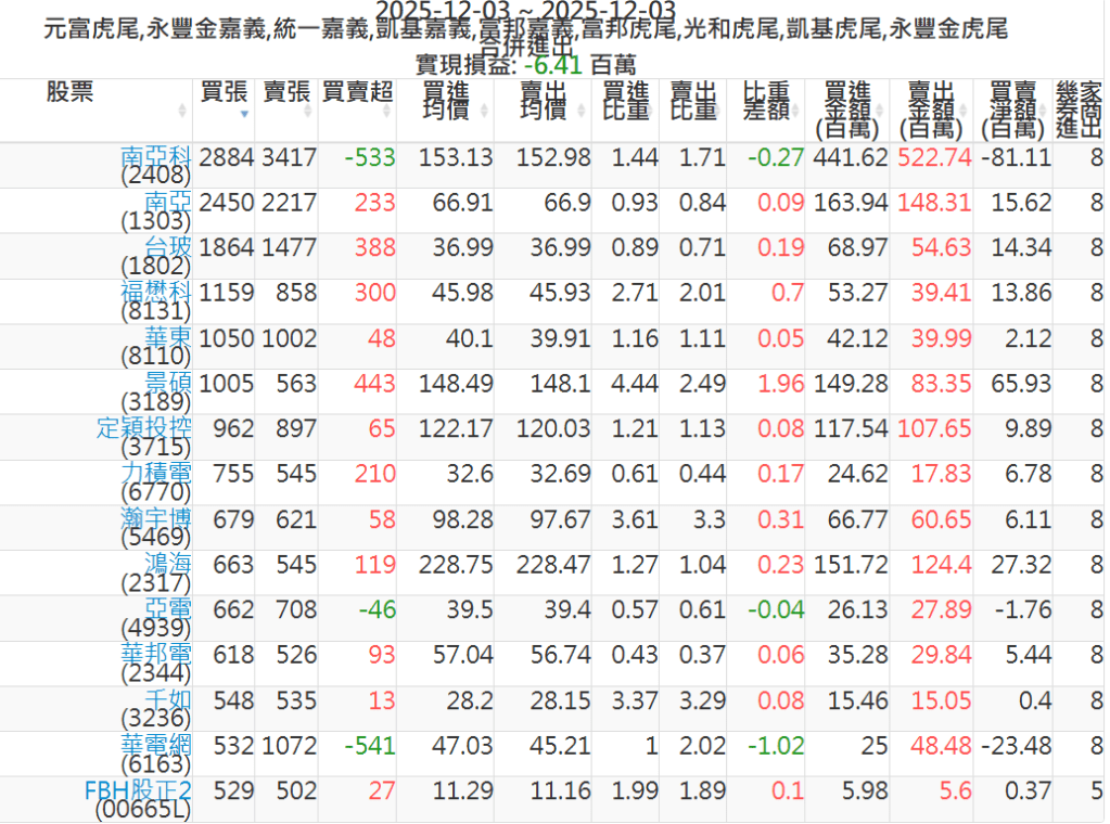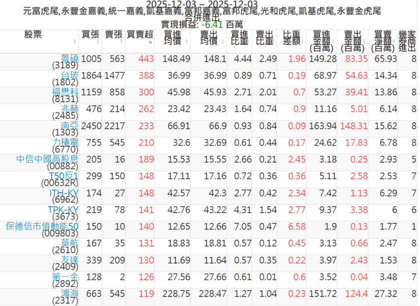 2025-1203主力買賣超個股 2025-12-03 股狗網小編 籌碼面每日資訊 發表留言 可參考下文 『如何查詢當沖、隔日沖分公司券商買賣』 主力當沖券商: 『元富虎尾』,『永豐金嘉義』,『統一嘉義』,『凱基嘉義』,『富邦嘉義』,『富邦虎尾』,『光和虎尾』,『凱基虎尾』,『永豐金虎尾』。 『當沖標的』 『買超股票』 『賣超股票』 免責宣言 本網站文章所提供資訊僅供參考,並無任何推介買賣之意,投資人應自行承擔交易風險。 分享此文: 按一下即可分享至 X(在新視窗中開啟) X 按一下以分享至 Facebook(在新視窗中開啟) Facebook 喜歡 正在載入...