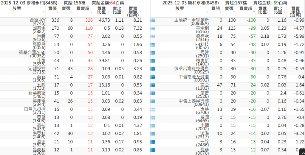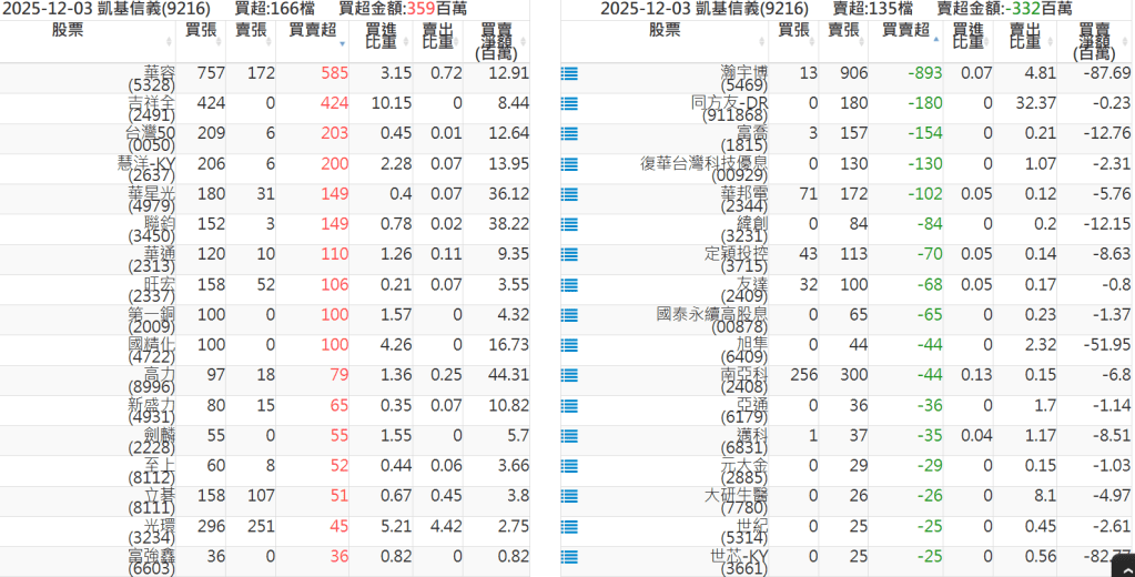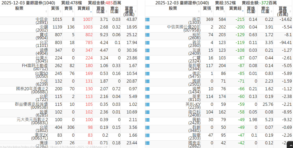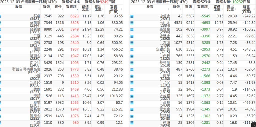 2025-1203關鍵券商買賣超 2025-12-03 股狗網小編 籌碼面每日資訊 發表留言 關鍵券商買賣超: 臺銀證券(1040): 台灣摩根士丹利(1470): 凱基台北(9268): 凱基信義(9216): 元大土城永寧(9875): 康和永和(845B) : 富邦建國(9658): 免責宣言 本網站文章所提供資訊僅供參考,並無任何推介買賣之意,投資人應自行承擔交易風險。 分享此文: 按一下即可分享至 X(在新視窗中開啟) X 按一下以分享至 Facebook(在新視窗中開啟) Facebook 喜歡 正在載入...
