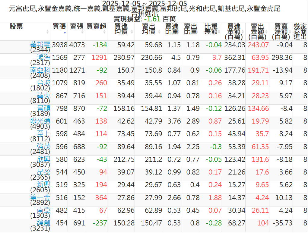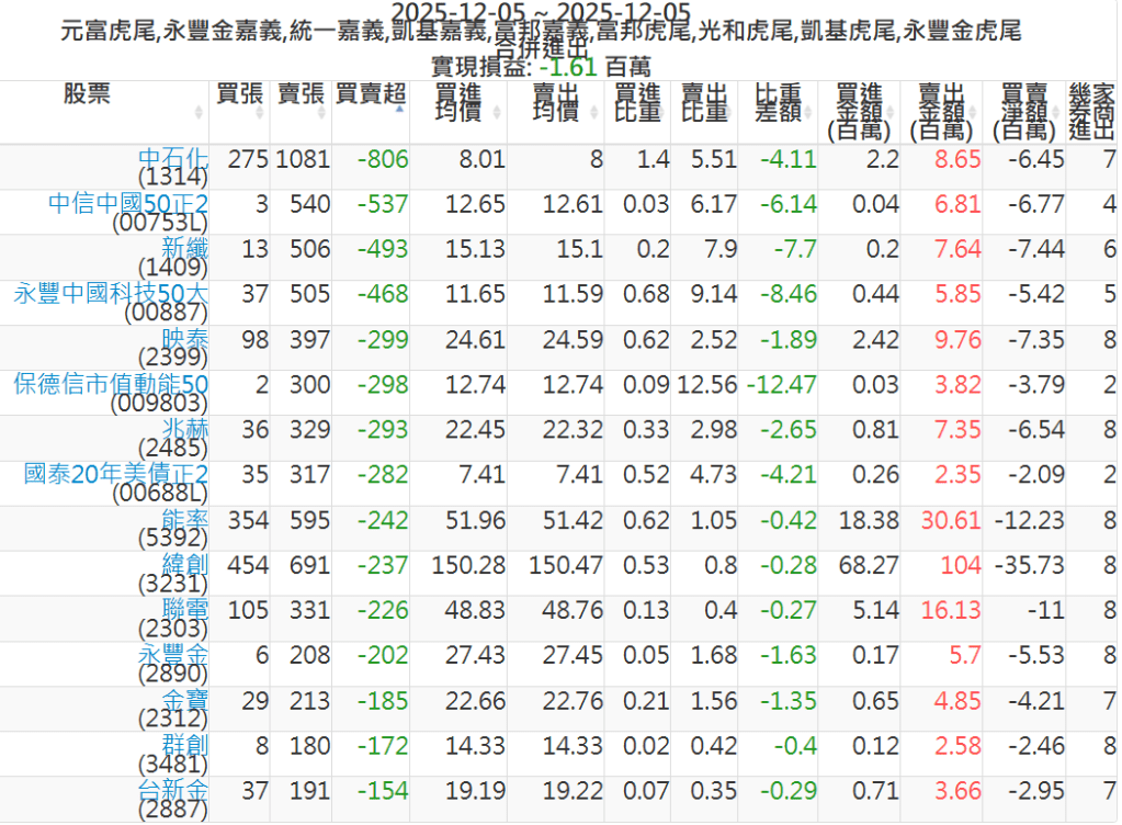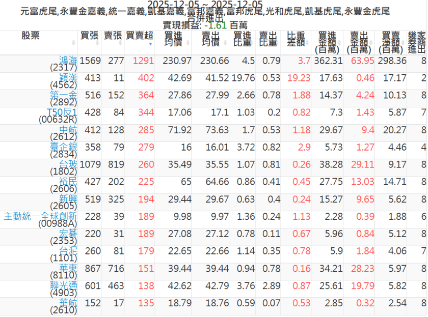 2025-1205主力買賣超個股 2025-12-05 股狗網小編 籌碼面每日資訊 發表留言 可參考下文 『如何查詢當沖、隔日沖分公司券商買賣』 主力當沖券商: 『元富虎尾』,『永豐金嘉義』,『統一嘉義』,『凱基嘉義』,『富邦嘉義』,『富邦虎尾』,『光和虎尾』,『凱基虎尾』,『永豐金虎尾』。 『當沖標的』 『買超股票』 『賣超股票』 免責宣言 本網站文章所提供資訊僅供參考,並無任何推介買賣之意,投資人應自行承擔交易風險。 分享此文: 按一下即可分享至 X(在新視窗中開啟) X 按一下以分享至 Facebook(在新視窗中開啟) Facebook 喜歡 正在載入...