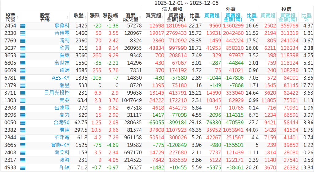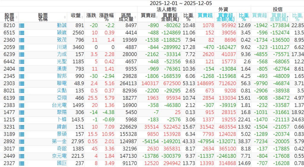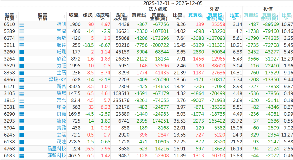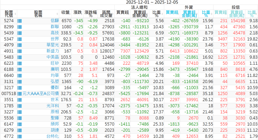 2025/12/01~2025/12/05近5日【投信】買賣超個股 2025-12-07 股狗網小編 投資誌-大盤 發表留言 【上市投信買超個股】(以金額排行,單位:萬) 【上市投信賣超個股】(以金額排行,單位:萬) 【上櫃投信買超個股】(以金額排行,單位:萬) 【上櫃投信賣超個股】(以金額排行,單位:萬) 免責宣言 本網站文章所提供資訊僅供參考,並無任何推介買賣之意,投資人應自行承擔交易風險。 分享此文: 按一下即可分享至 X(在新視窗中開啟) X 按一下以分享至 Facebook(在新視窗中開啟) Facebook 喜歡 正在載入...