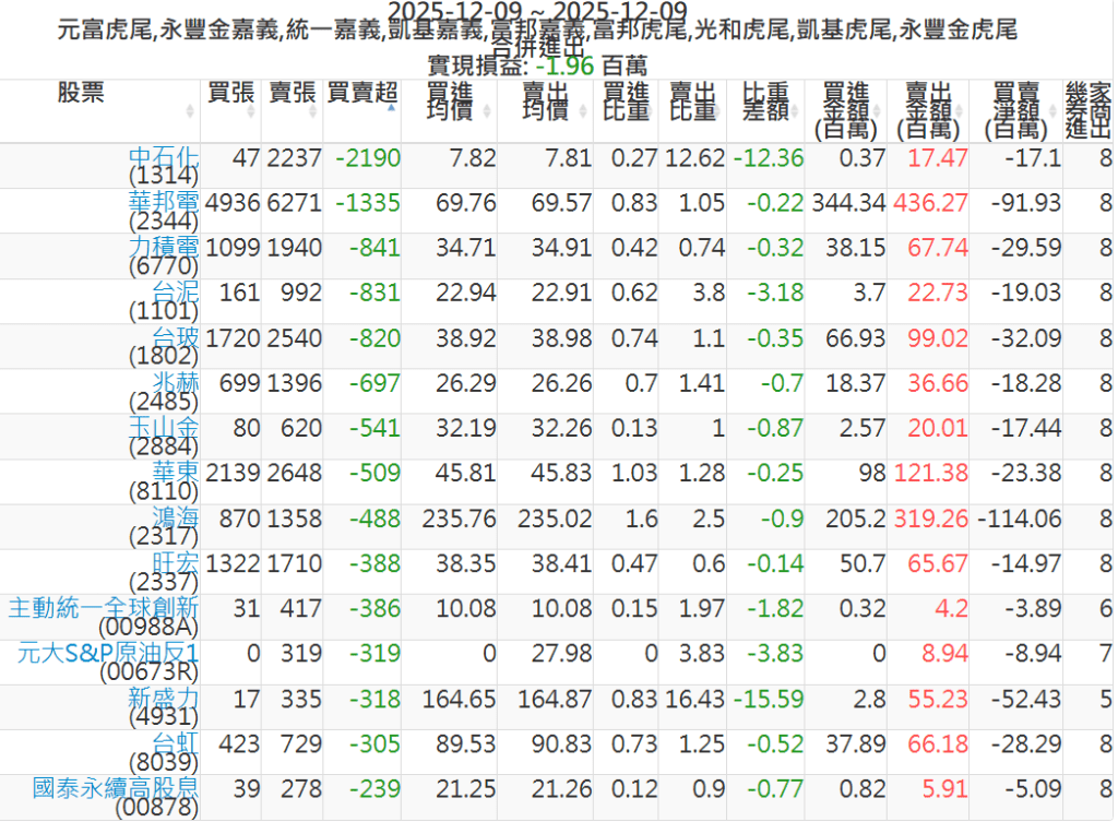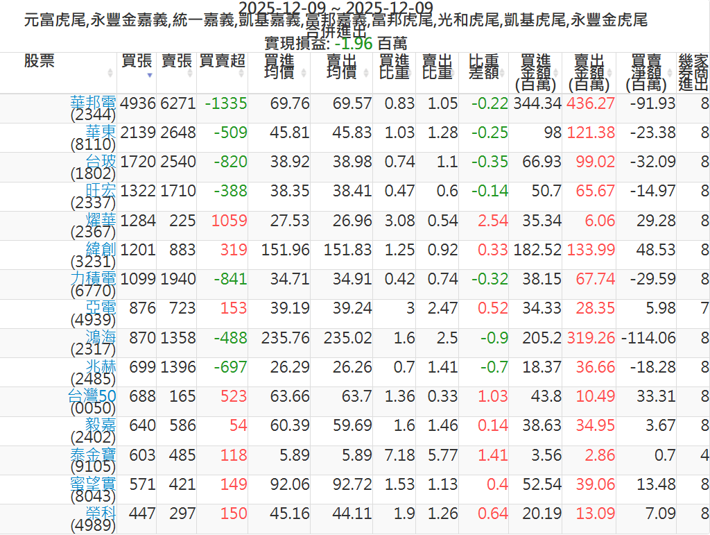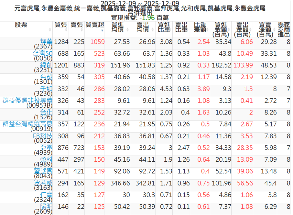 2025-1209主力買賣超個股 2025-12-09 股狗網小編 籌碼面每日資訊 發表留言 可參考下文 『如何查詢當沖、隔日沖分公司券商買賣』 主力當沖券商: 『元富虎尾』,『永豐金嘉義』,『統一嘉義』,『凱基嘉義』,『富邦嘉義』,『富邦虎尾』,『光和虎尾』,『凱基虎尾』,『永豐金虎尾』。 『當沖標的』 『買超股票』 『賣超股票』 免責宣言 本網站文章所提供資訊僅供參考,並無任何推介買賣之意,投資人應自行承擔交易風險。 分享此文: 按一下即可分享至 X(在新視窗中開啟) X 按一下以分享至 Facebook(在新視窗中開啟) Facebook 喜歡 正在載入...