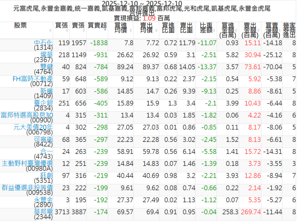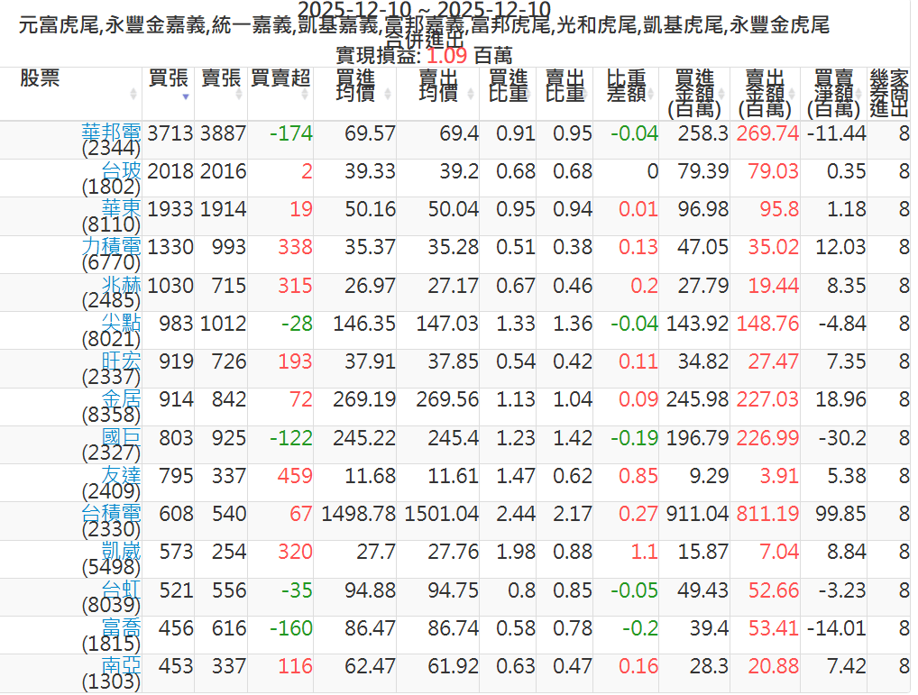 2025-1210主力買賣超個股 2025-12-10 股狗網小編 籌碼面每日資訊 發表留言 可參考下文 『如何查詢當沖、隔日沖分公司券商買賣』 主力當沖券商: 『元富虎尾』,『永豐金嘉義』,『統一嘉義』,『凱基嘉義』,『富邦嘉義』,『富邦虎尾』,『光和虎尾』,『凱基虎尾』,『永豐金虎尾』。 『當沖標的』 『買超股票』 『賣超股票』 免責宣言 本網站文章所提供資訊僅供參考,並無任何推介買賣之意,投資人應自行承擔交易風險。 分享此文: 按一下即可分享至 X(在新視窗中開啟) X 按一下以分享至 Facebook(在新視窗中開啟) Facebook 喜歡 正在載入...