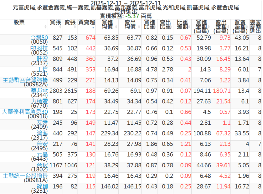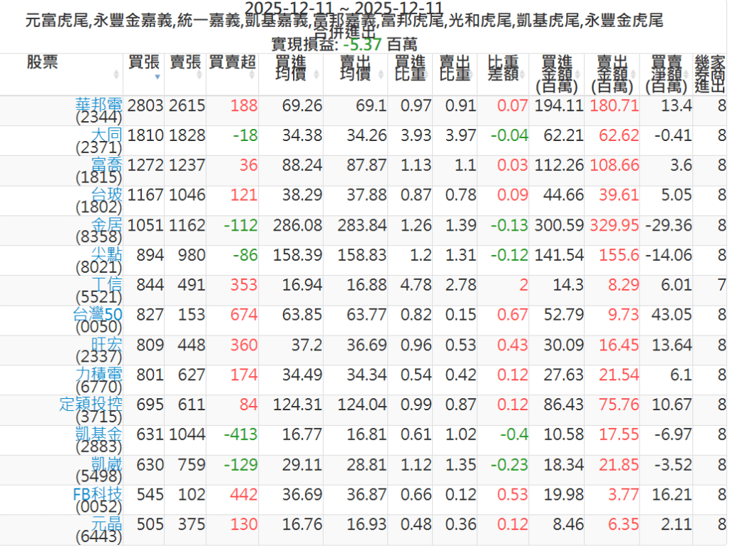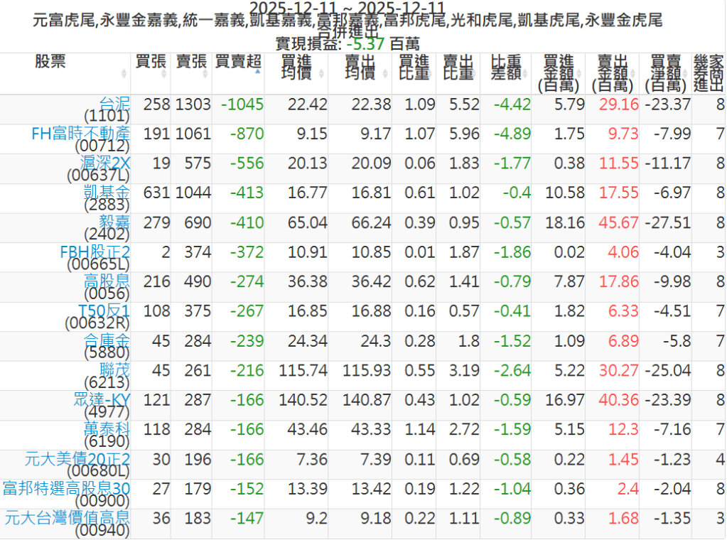 2025-1211主力買賣超個股 2025-12-11 股狗網小編 籌碼面每日資訊 發表留言 可參考下文 『如何查詢當沖、隔日沖分公司券商買賣』 主力當沖券商: 『元富虎尾』,『永豐金嘉義』,『統一嘉義』,『凱基嘉義』,『富邦嘉義』,『富邦虎尾』,『光和虎尾』,『凱基虎尾』,『永豐金虎尾』。 『當沖標的』 『買超股票』 『賣超股票』 免責宣言 本網站文章所提供資訊僅供參考,並無任何推介買賣之意,投資人應自行承擔交易風險。 分享此文: 按一下即可分享至 X(在新視窗中開啟) X 按一下以分享至 Facebook(在新視窗中開啟) Facebook 喜歡 正在載入...
