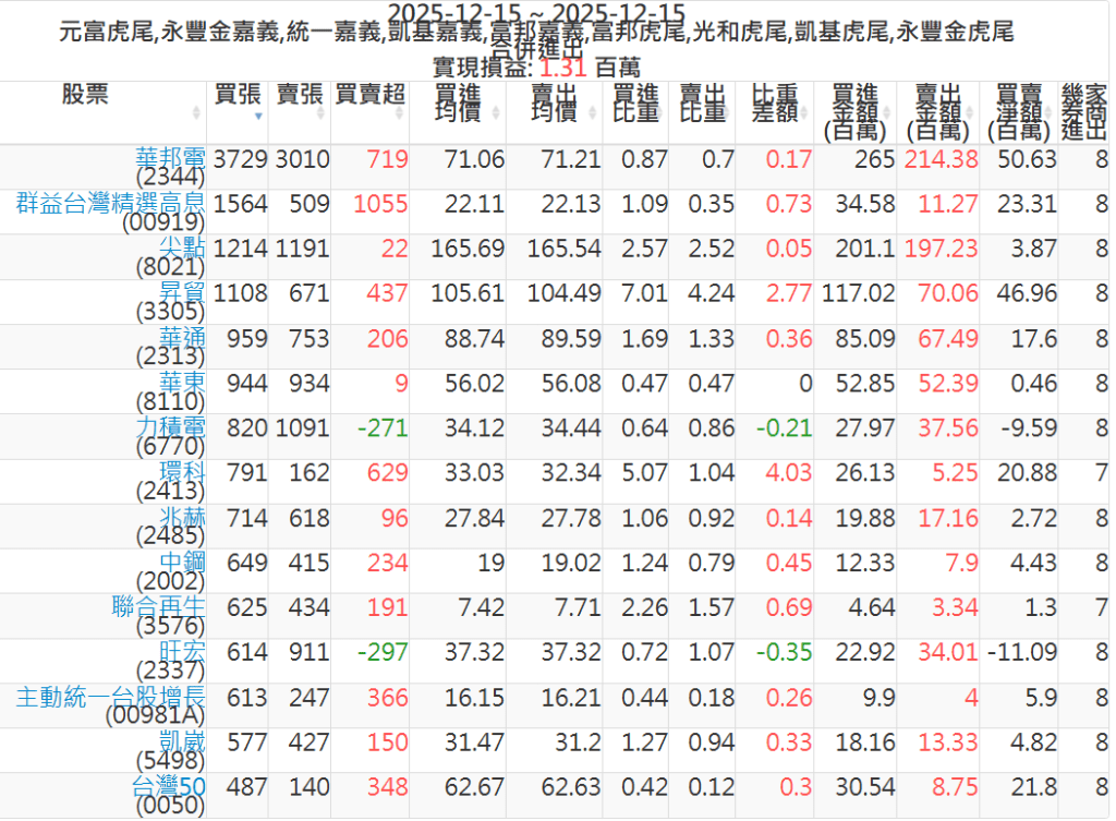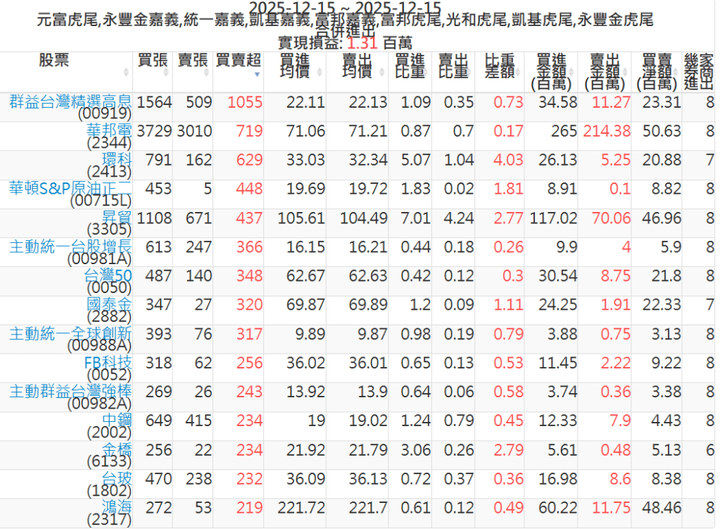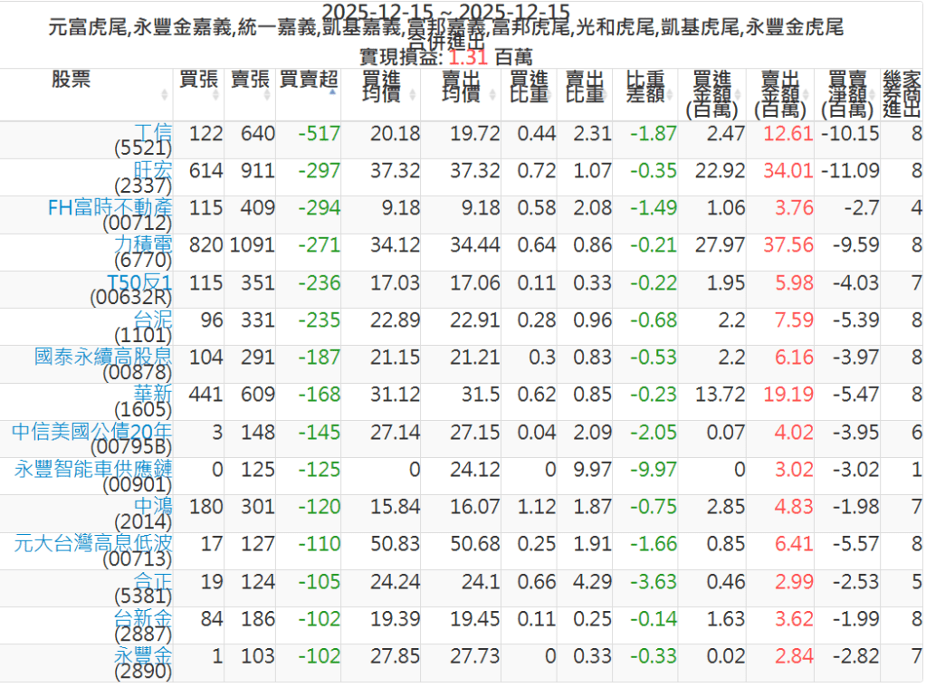 2025-1215主力買賣超個股 2025-12-15 股狗網小編 籌碼面每日資訊 發表留言 可參考下文 『如何查詢當沖、隔日沖分公司券商買賣』 主力當沖券商: 『元富虎尾』,『永豐金嘉義』,『統一嘉義』,『凱基嘉義』,『富邦嘉義』,『富邦虎尾』,『光和虎尾』,『凱基虎尾』,『永豐金虎尾』。 『當沖標的』 『買超股票』 『賣超股票』 免責宣言 本網站文章所提供資訊僅供參考,並無任何推介買賣之意,投資人應自行承擔交易風險。 分享此文: 按一下即可分享至 X(在新視窗中開啟) X 按一下以分享至 Facebook(在新視窗中開啟) Facebook 喜歡 正在載入...