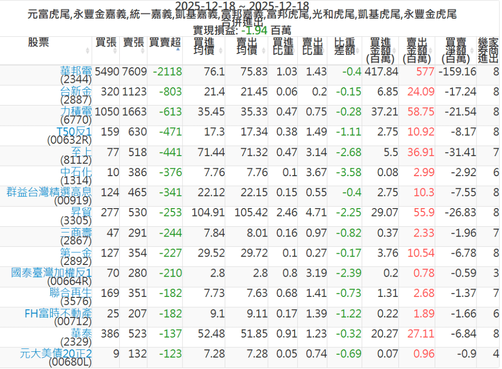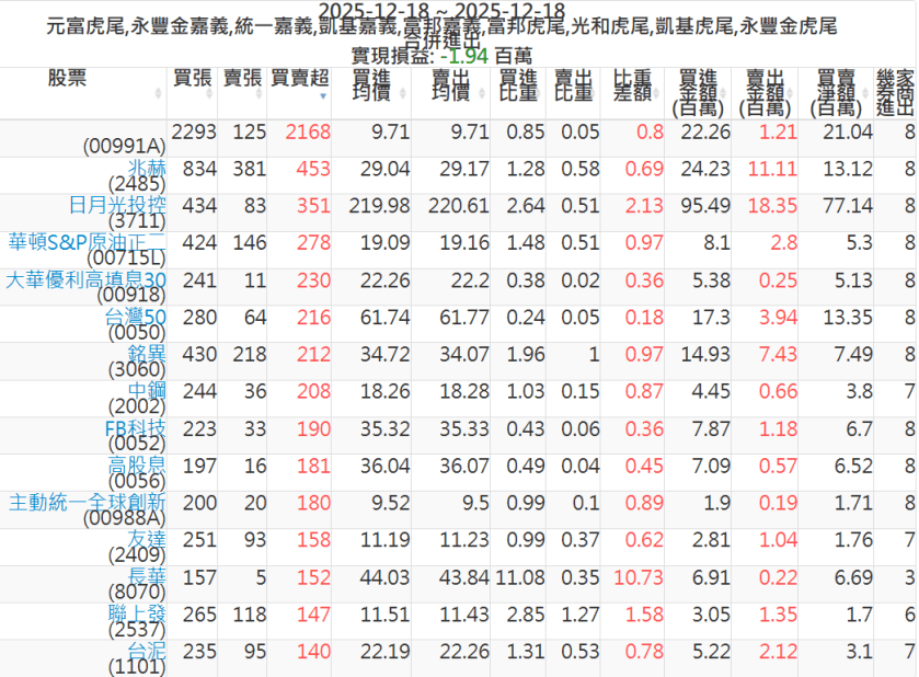2025-1218主力買賣超個股 2025-12-18 股狗網小編 籌碼面每日資訊 發表留言 可參考下文 『如何查詢當沖、隔日沖分公司券商買賣』 主力當沖券商: 『元富虎尾』,『永豐金嘉義』,『統一嘉義』,『凱基嘉義』,『富邦嘉義』,『富邦虎尾』,『光和虎尾』,『凱基虎尾』,『永豐金虎尾』。 『當沖標的』 『買超股票』 『賣超股票』 免責宣言 本網站文章所提供資訊僅供參考,並無任何推介買賣之意,投資人應自行承擔交易風險。 分享此文: 按一下即可分享至 X(在新視窗中開啟) X 按一下以分享至 Facebook(在新視窗中開啟) Facebook 喜歡 正在載入...