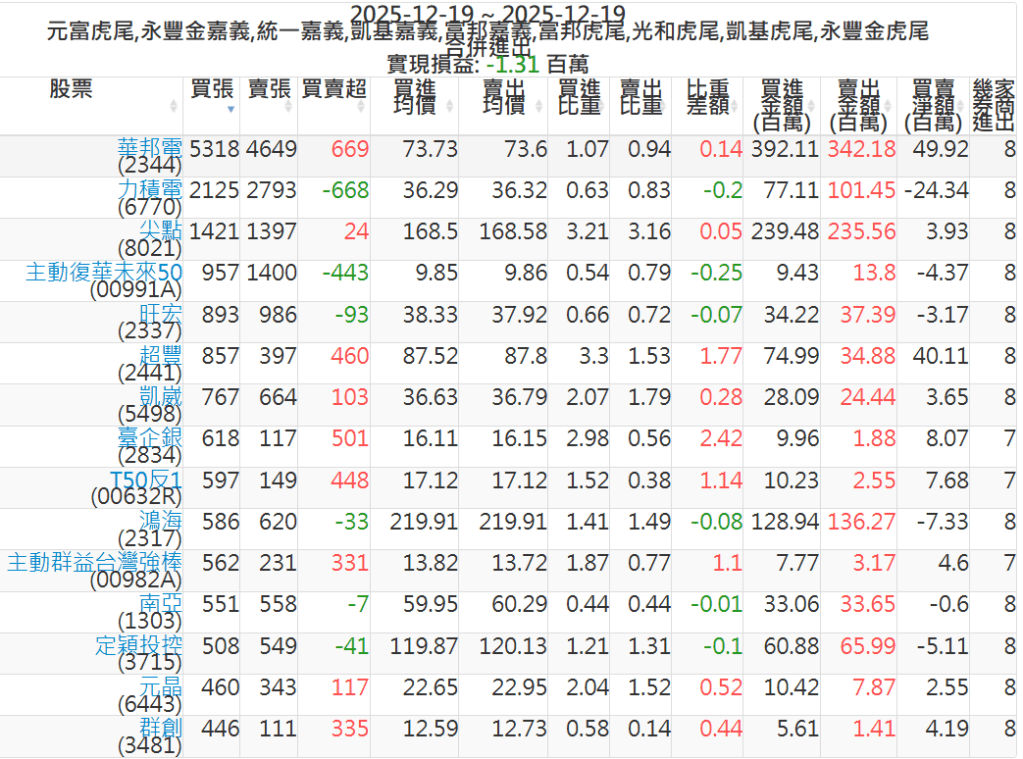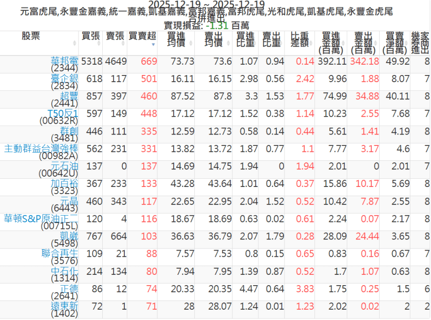 2025-1219主力買賣超個股 2025-12-19 股狗網小編 籌碼面每日資訊 發表留言 可參考下文 『如何查詢當沖、隔日沖分公司券商買賣』 主力當沖券商: 『元富虎尾』,『永豐金嘉義』,『統一嘉義』,『凱基嘉義』,『富邦嘉義』,『富邦虎尾』,『光和虎尾』,『凱基虎尾』,『永豐金虎尾』。 『當沖標的』 『買超股票』 『賣超股票』 免責宣言 本網站文章所提供資訊僅供參考,並無任何推介買賣之意,投資人應自行承擔交易風險。 分享此文: 按一下即可分享至 X(在新視窗中開啟) X 按一下以分享至 Facebook(在新視窗中開啟) Facebook 喜歡 正在載入...