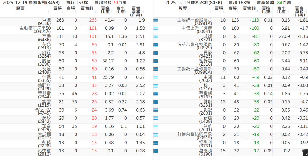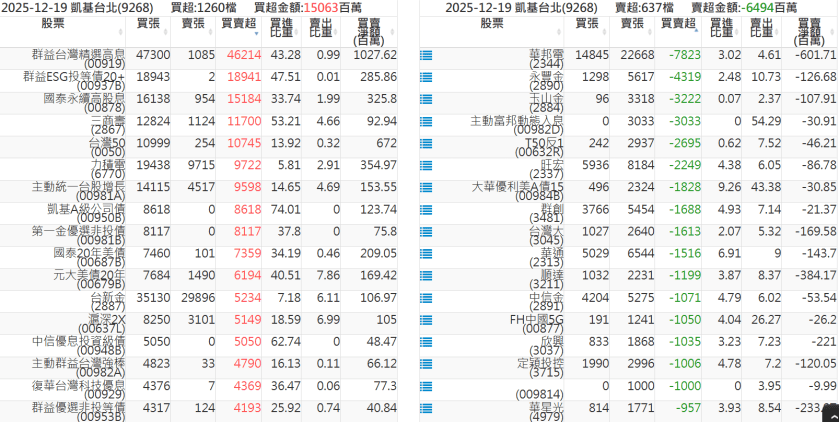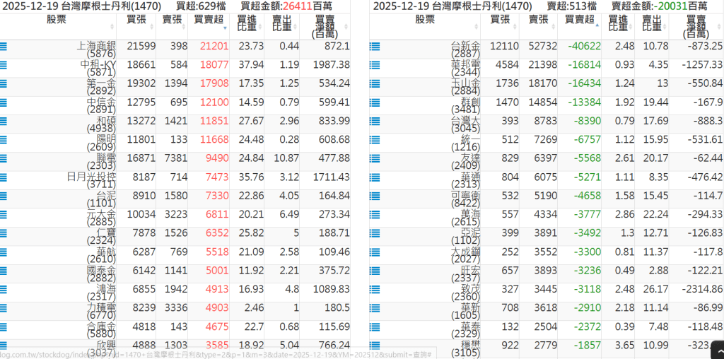2025-1219關鍵券商買賣超 2025-12-19 股狗網小編 籌碼面每日資訊 發表留言 關鍵券商買賣超: 臺銀證券(1040): 台灣摩根士丹利(1470): 凱基台北(9268): 凱基信義(9216): 元大土城永寧(9875): 康和永和(845B) : 富邦建國(9658): 免責宣言 本網站文章所提供資訊僅供參考,並無任何推介買賣之意,投資人應自行承擔交易風險。 分享此文: 按一下即可分享至 X(在新視窗中開啟) X 按一下以分享至 Facebook(在新視窗中開啟) Facebook 喜歡 正在載入...