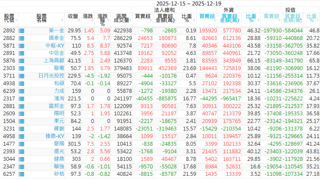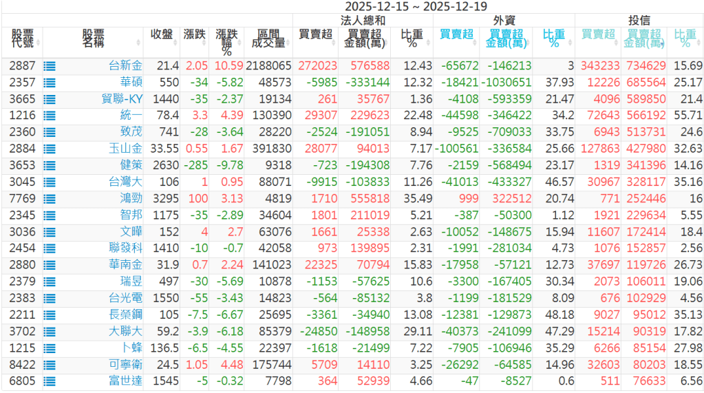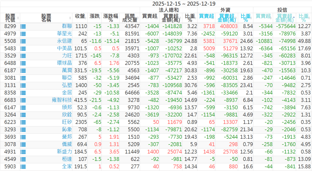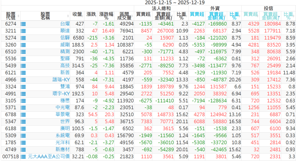 2025/12/15~2025/12/19近5日【投信】買賣超個股 2025-12-21 股狗網小編 投資誌-大盤 發表留言 【上市投信買超個股】(以金額排行,單位:萬) 【上市投信賣超個股】(以金額排行,單位:萬) 【上櫃投信買超個股】(以金額排行,單位:萬) 【上櫃投信賣超個股】(以金額排行,單位:萬) 免責宣言 本網站文章所提供資訊僅供參考,並無任何推介買賣之意,投資人應自行承擔交易風險。 分享此文: 按一下即可分享至 X(在新視窗中開啟) X 按一下以分享至 Facebook(在新視窗中開啟) Facebook 喜歡 正在載入...