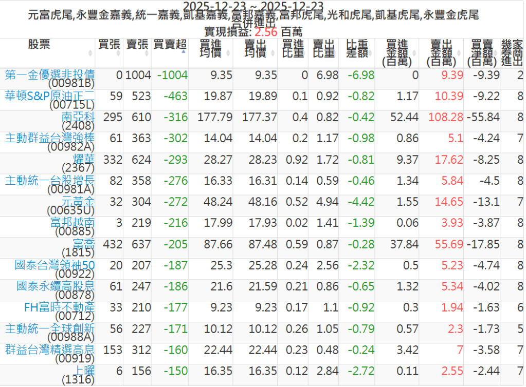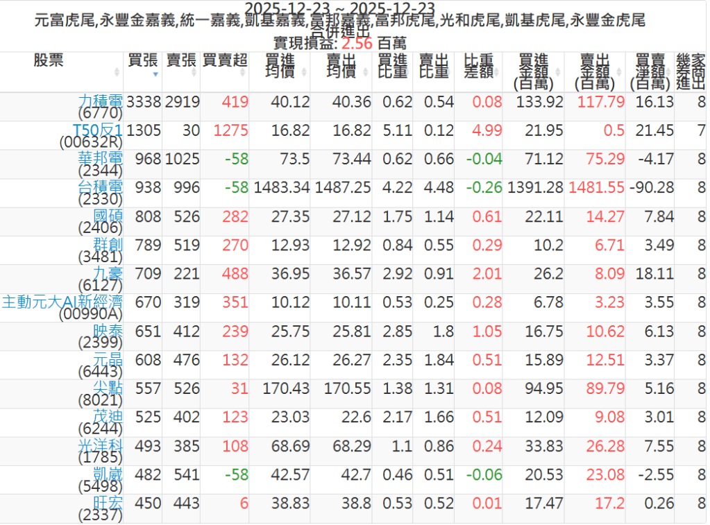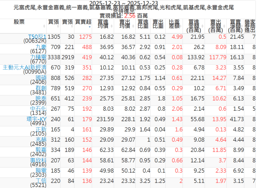 2025-1223主力買賣超個股 2025-12-23 股狗網小編 籌碼面每日資訊 發表留言 可參考下文 『如何查詢當沖、隔日沖分公司券商買賣』 主力當沖券商: 『元富虎尾』,『永豐金嘉義』,『統一嘉義』,『凱基嘉義』,『富邦嘉義』,『富邦虎尾』,『光和虎尾』,『凱基虎尾』,『永豐金虎尾』。 『當沖標的』 『買超股票』 『賣超股票』 免責宣言 本網站文章所提供資訊僅供參考,並無任何推介買賣之意,投資人應自行承擔交易風險。 分享此文: 按一下即可分享至 X(在新視窗中開啟) X 按一下以分享至 Facebook(在新視窗中開啟) Facebook 喜歡 正在載入...