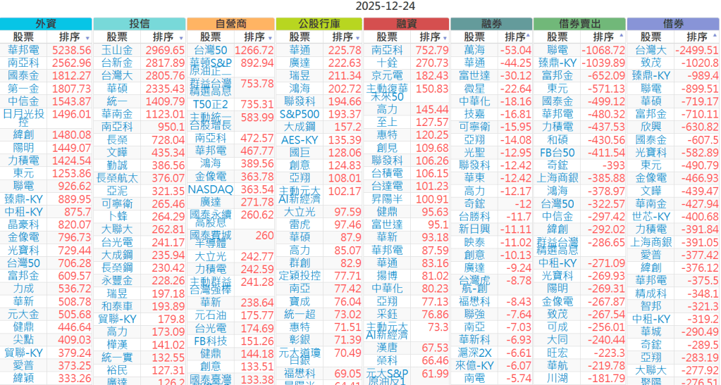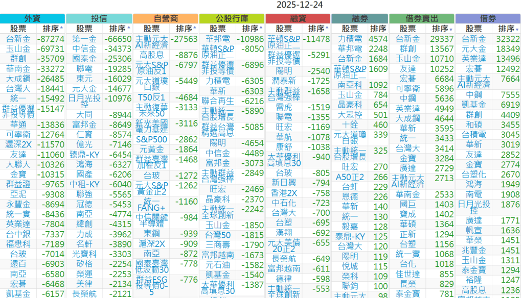 2025-1224【外資、投信】買賣超個股 2025-12-24 股狗網小編 投資誌-大盤 發表留言 上市:【外資、投信】買超(依金額) (單位:百萬) 上市:【外資、投信】賣超(依金額) (單位:百萬) 上市:【外資、投信】買超(依張數) (單位:張數) 上市:【外資、投信】賣超(依張數) (單位:張數) 免責宣言 本網站文章所提供資訊僅供參考,並無任何推介買賣之意,投資人應自行承擔交易風險。 分享此文: 按一下即可分享至 X(在新視窗中開啟) X 按一下以分享至 Facebook(在新視窗中開啟) Facebook 喜歡 正在載入...