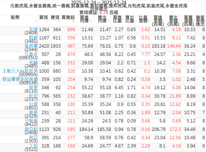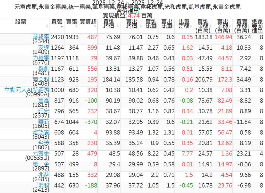 2025-1224主力買賣超個股 2025-12-24 股狗網小編 籌碼面每日資訊 發表留言 可參考下文 『如何查詢當沖、隔日沖分公司券商買賣』 主力當沖券商: 『元富虎尾』,『永豐金嘉義』,『統一嘉義』,『凱基嘉義』,『富邦嘉義』,『富邦虎尾』,『光和虎尾』,『凱基虎尾』,『永豐金虎尾』。 『當沖標的』 『買超股票』 『賣超股票』 免責宣言 本網站文章所提供資訊僅供參考,並無任何推介買賣之意,投資人應自行承擔交易風險。 分享此文: 按一下即可分享至 X(在新視窗中開啟) X 按一下以分享至 Facebook(在新視窗中開啟) Facebook 喜歡 正在載入...