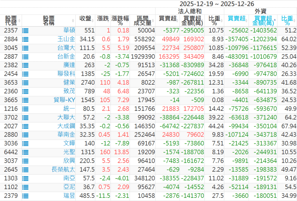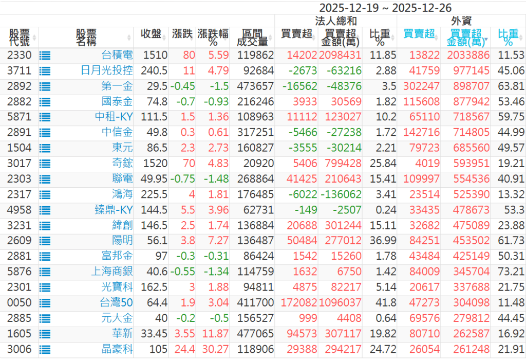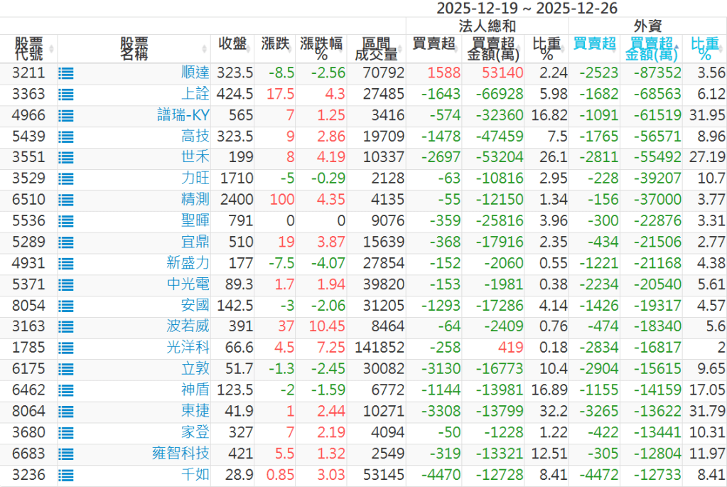 2025/12/19~2025/12/26近5日【外資】買賣超個股 2025-12-28 股狗網小編 投資誌-大盤 發表留言 外資本周累積【買超】約188億元。 【上市外資買超個股】(以金額排行,單位:萬) 【上市外資賣超個股】(以金額排行,單位:萬) 【上櫃外資買超個股】(以金額排行,單位:萬) 【上櫃外資賣超個股】(以金額排行,單位:萬) 免責宣言 本網站文章所提供資訊僅供參考,並無任何推介買賣之意,投資人應自行承擔交易風險。 分享此文: 按一下即可分享至 X(在新視窗中開啟) X 按一下以分享至 Facebook(在新視窗中開啟) Facebook 喜歡 正在載入...