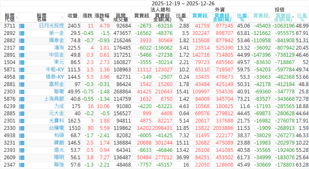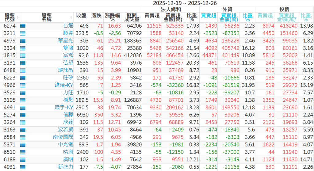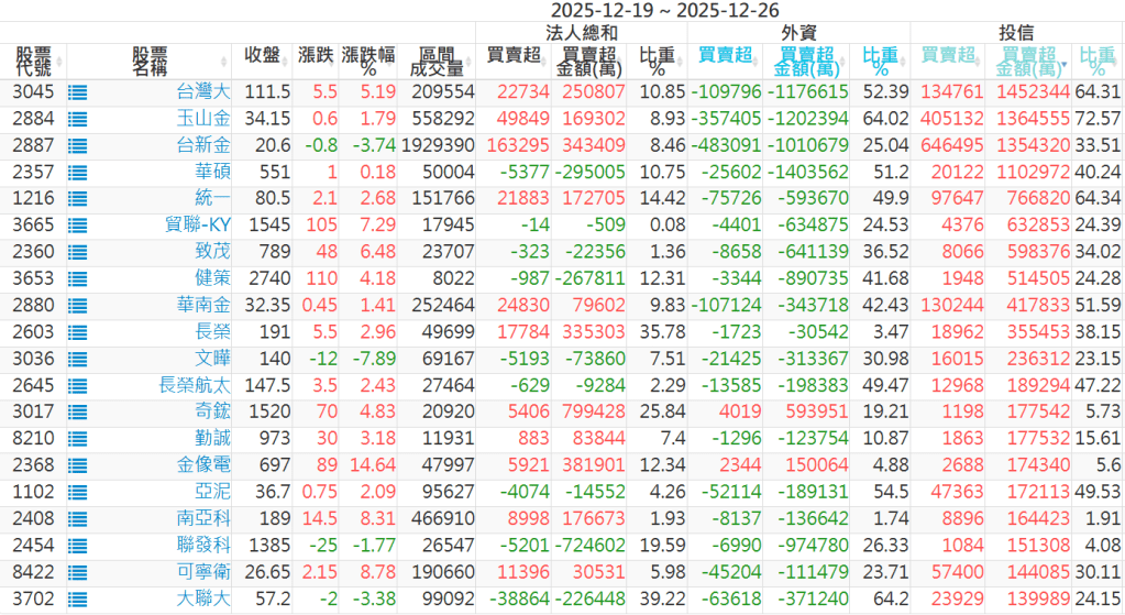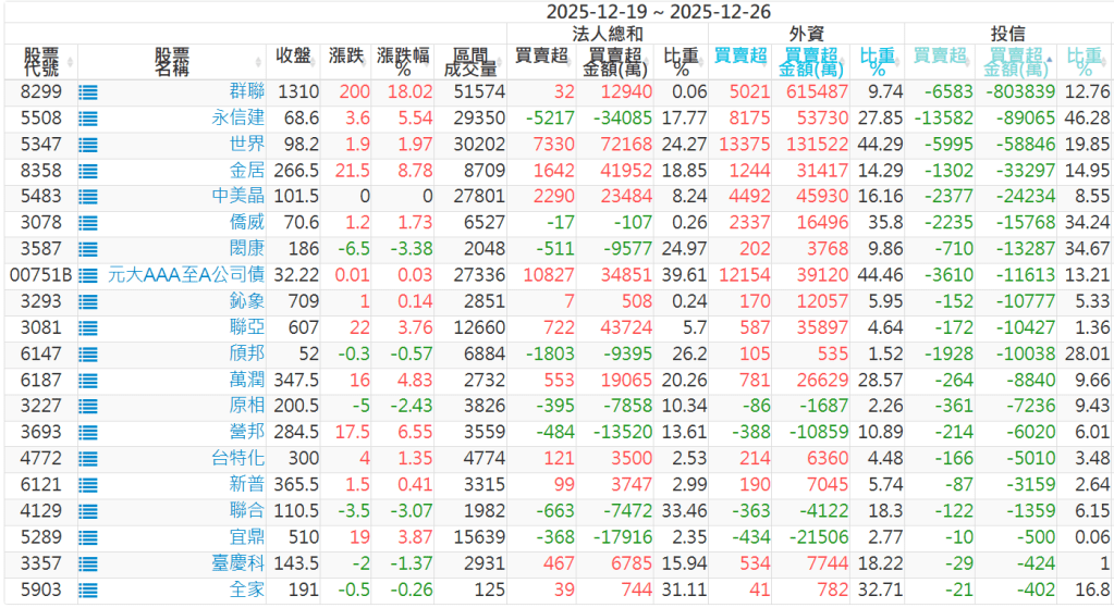 2025/12/19~2025/12/26近5日【投信】買賣超個股 2025-12-28 股狗網小編 投資誌-大盤 發表留言 【上市投信買超個股】(以金額排行,單位:萬) 【上市投信賣超個股】(以金額排行,單位:萬) 【上櫃投信買超個股】(以金額排行,單位:萬) 【上櫃投信賣超個股】(以金額排行,單位:萬) 免責宣言 本網站文章所提供資訊僅供參考,並無任何推介買賣之意,投資人應自行承擔交易風險。 分享此文: 按一下即可分享至 X(在新視窗中開啟) X 按一下以分享至 Facebook(在新視窗中開啟) Facebook 喜歡 正在載入...