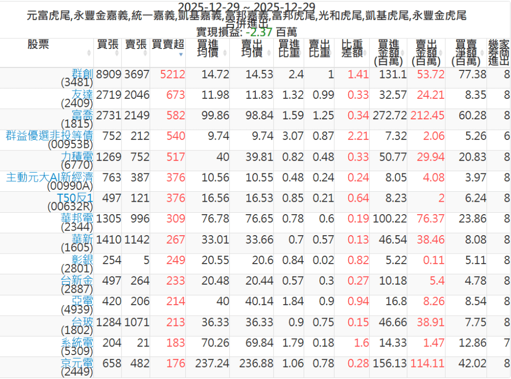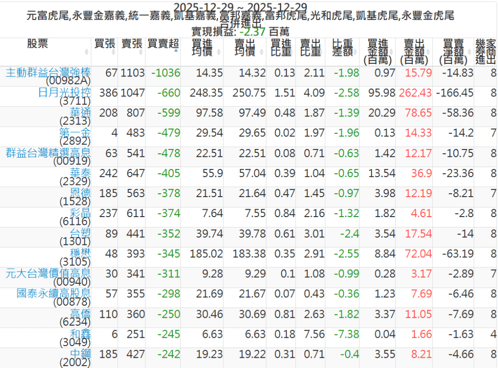 2025-1229主力買賣超個股 2025-12-29 股狗網小編 籌碼面每日資訊 發表留言 可參考下文 『如何查詢當沖、隔日沖分公司券商買賣』 主力當沖券商: 『元富虎尾』,『永豐金嘉義』,『統一嘉義』,『凱基嘉義』,『富邦嘉義』,『富邦虎尾』,『光和虎尾』,『凱基虎尾』,『永豐金虎尾』。 『當沖標的』 『買超股票』 『賣超股票』 免責宣言 本網站文章所提供資訊僅供參考,並無任何推介買賣之意,投資人應自行承擔交易風險。 分享此文: 按一下即可分享至 X(在新視窗中開啟) X 按一下以分享至 Facebook(在新視窗中開啟) Facebook 喜歡 正在載入...