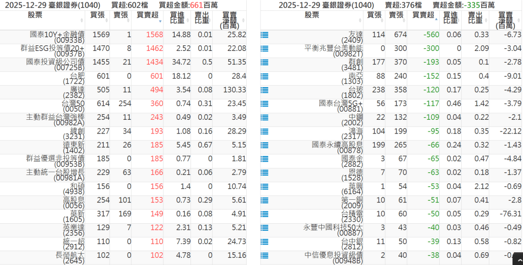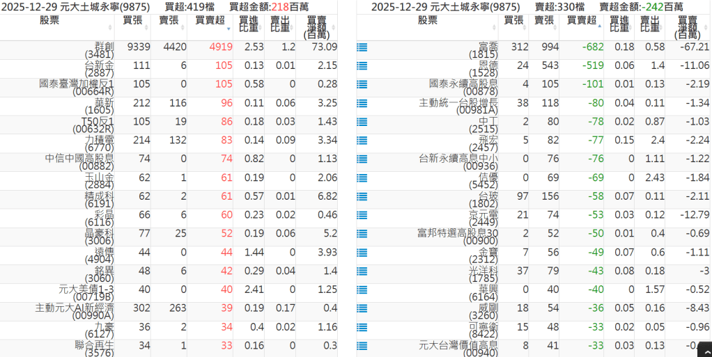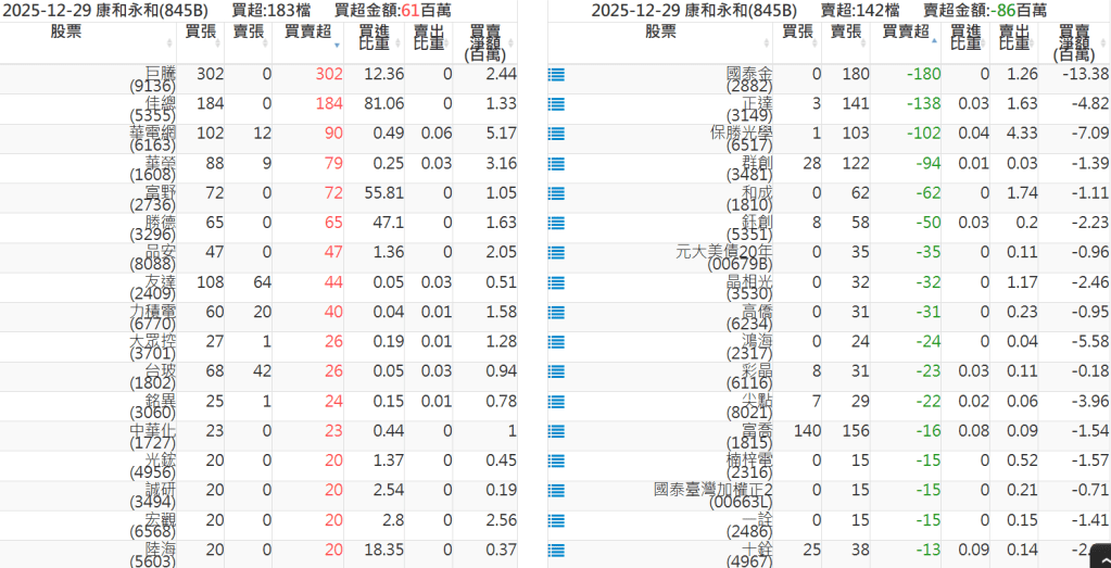 2025-1229關鍵券商買賣超 2025-12-29 股狗網小編 籌碼面每日資訊 發表留言 關鍵券商買賣超: 臺銀證券(1040): 台灣摩根士丹利(1470): 凱基台北(9268): 凱基信義(9216): 元大土城永寧(9875): 康和永和(845B) : 富邦建國(9658): 免責宣言 本網站文章所提供資訊僅供參考,並無任何推介買賣之意,投資人應自行承擔交易風險。 分享此文: 按一下即可分享至 X(在新視窗中開啟) X 按一下以分享至 Facebook(在新視窗中開啟) Facebook 喜歡 正在載入...