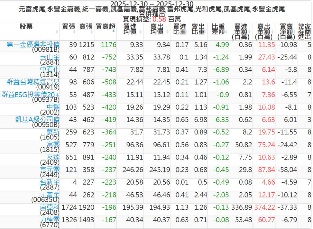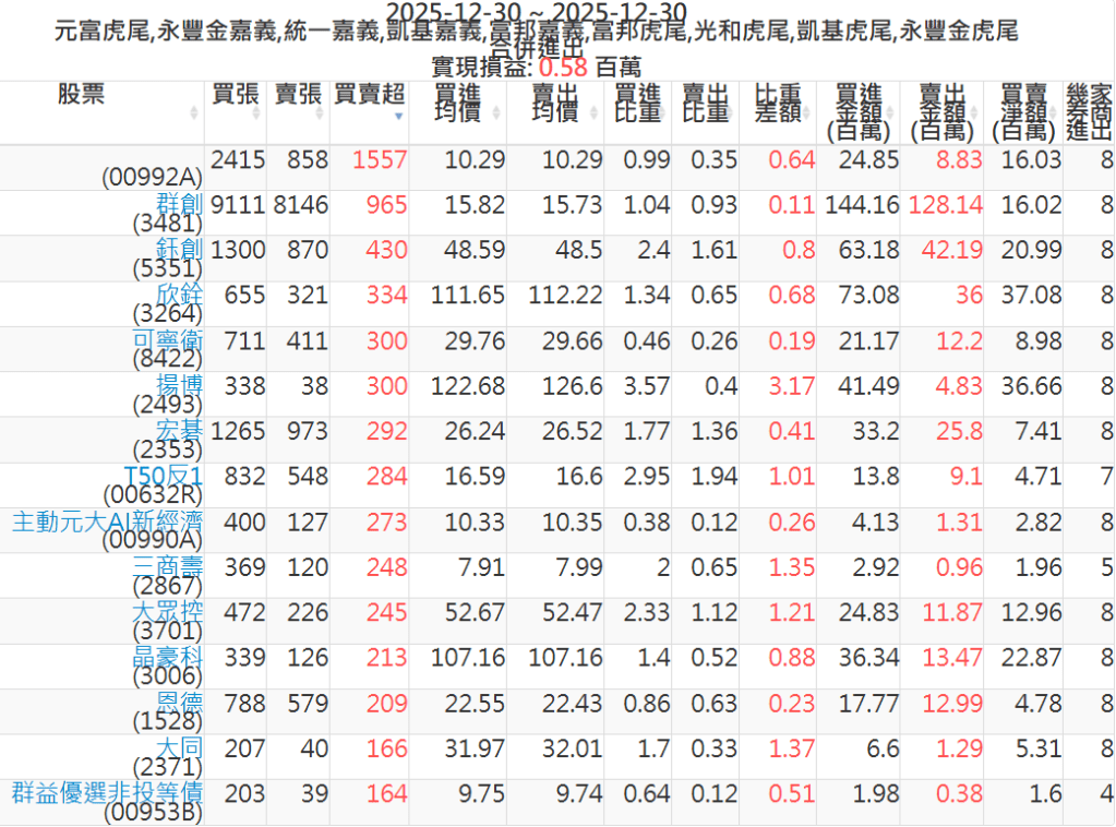 2025-1230主力買賣超個股 2025-12-30 股狗網小編 籌碼面每日資訊 發表留言 可參考下文 『如何查詢當沖、隔日沖分公司券商買賣』 主力當沖券商: 『元富虎尾』,『永豐金嘉義』,『統一嘉義』,『凱基嘉義』,『富邦嘉義』,『富邦虎尾』,『光和虎尾』,『凱基虎尾』,『永豐金虎尾』。 『當沖標的』 『買超股票』 『賣超股票』 免責宣言 本網站文章所提供資訊僅供參考,並無任何推介買賣之意,投資人應自行承擔交易風險。 分享此文: 按一下即可分享至 X(在新視窗中開啟) X 按一下以分享至 Facebook(在新視窗中開啟) Facebook 喜歡 正在載入...